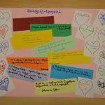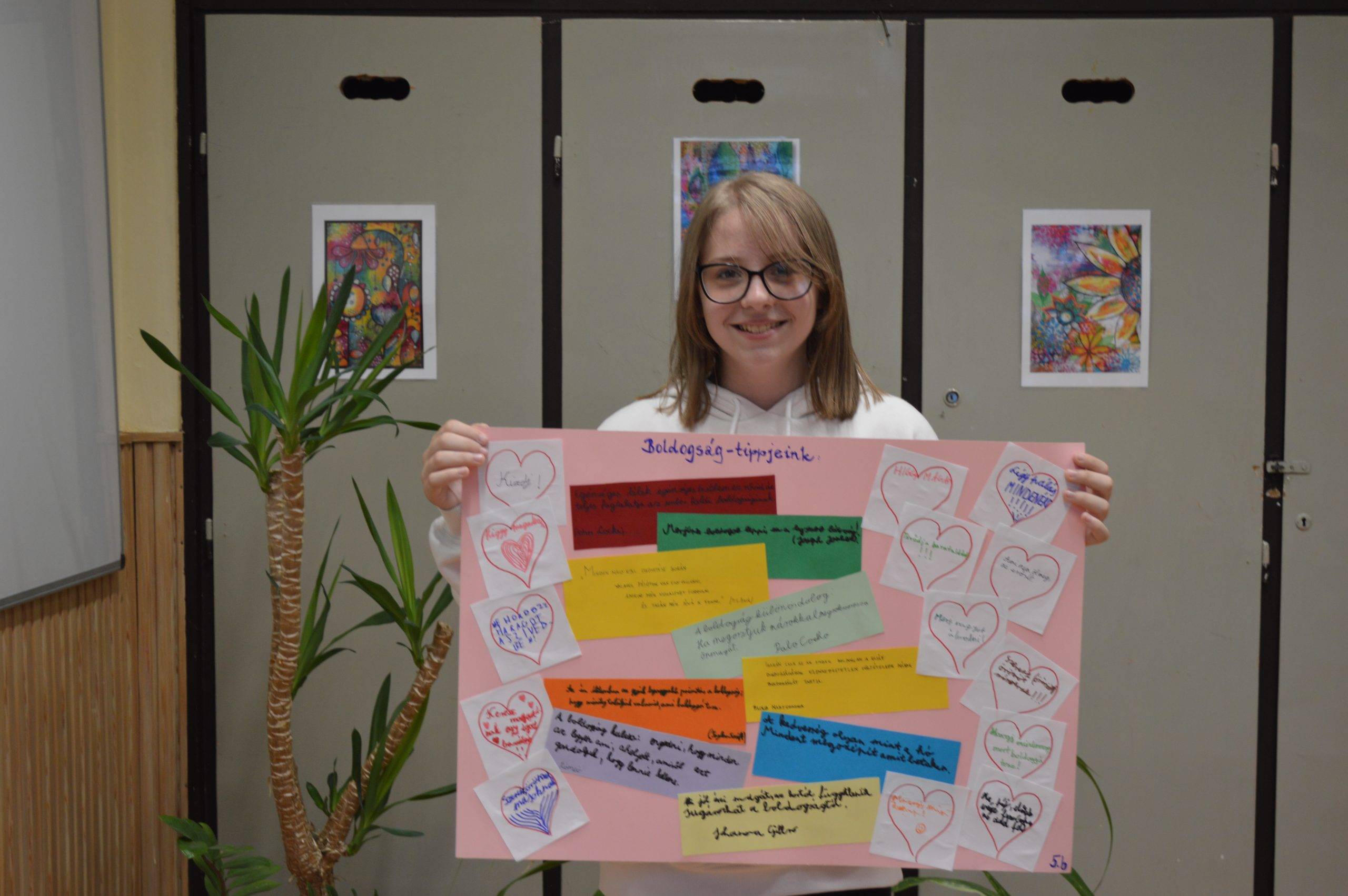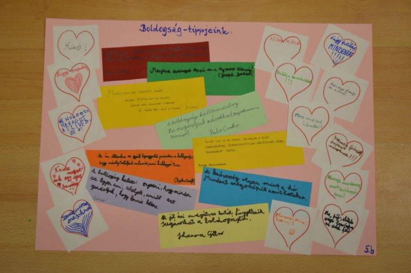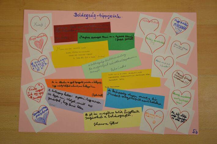 Az 5.b-s csoport tagjai idézeteket gyűjtöttek a boldogságról, és ezt kiegészítették szívecskékbe írt tanácsaikkal. Így készült el tablójuk.