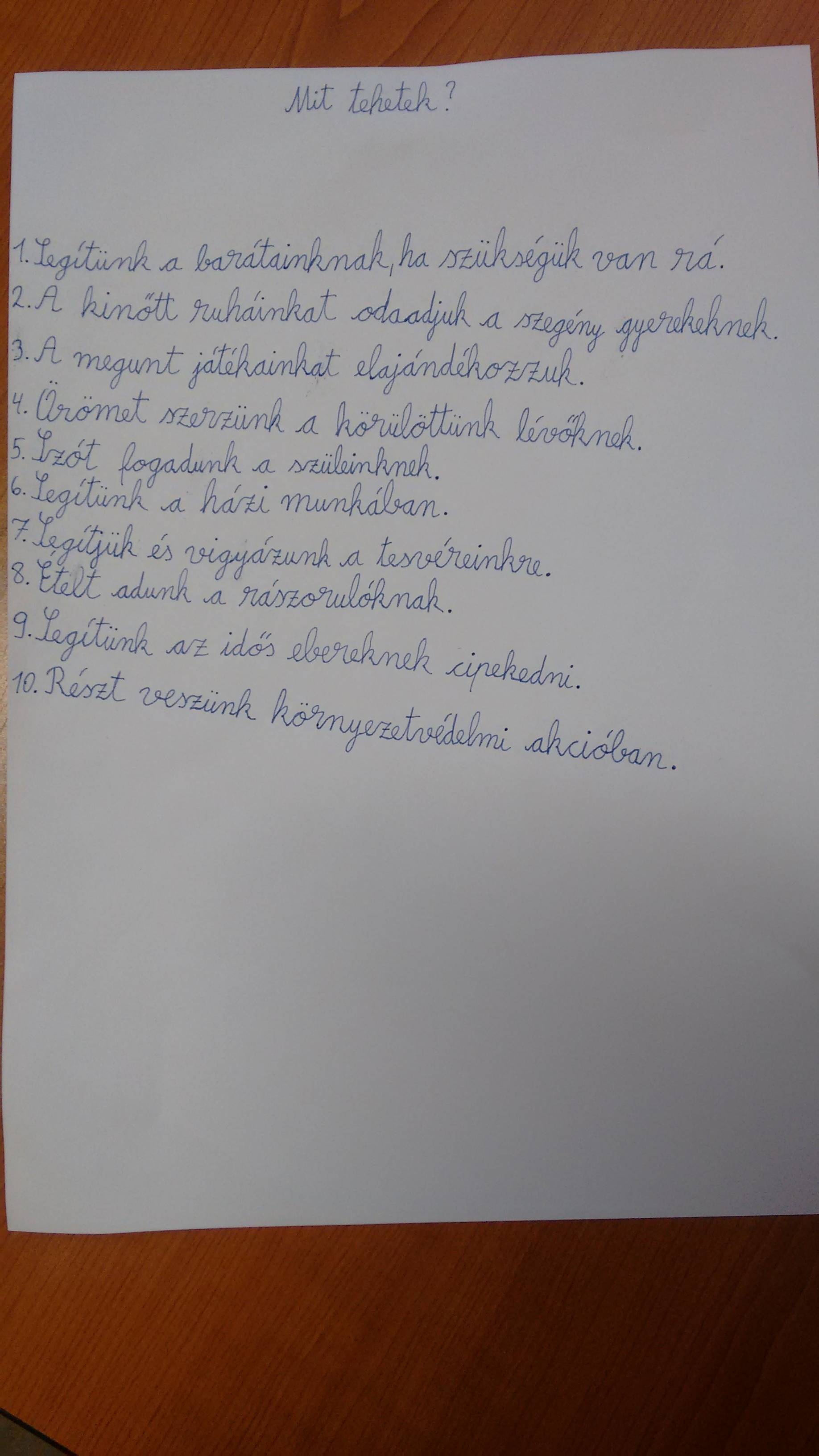 A gyerekek közös munkával összeírták azokat a dolgokat, melyekkel a körülöttük élők életét még szebbé tehetnék. Hozzá is láttak ezek megvalósításához: ajándékot készítettek a rászoruló gyerekek számára, saját készítésű karácsonyi díszeket árultak az iskolában megrendezett jótékonysági vásáron. Elkészítették az adventi jócselekedetek naptárát is, melyre mindenki felírta, milyen jócselekedetet sikerült végrehajtania.