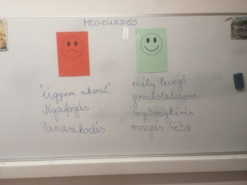 A „Megküzdési stratégiákkal” foglalkozó Boldogságóránkat is ráhangolódással kezdtük. Arra kértem a gyerekeket, hogy soroljanak fel olyan dolgokat, melyek idegesítik őket az iskolában és próbálják megfogalmazni, hogy mit éreznek olyankor. Ezt követően bevezettük, illetve tavalyi tapasztalataink alapján felelevenítettük, hogy mi is az a megküzdés, és példákat gyűjtöttünk, hogy mi az ami segít, mi az ami nem a nehézségekkel való megküzdésben, majd 4 egyszerű stratégiát tanultunk meg: mély levegő, gondolatcsere, segítségkérés illetve mozgás/szünet. A gyerekek elmondták tapasztalataikat, véleményüket a stratégiákkal kapcsolatban.