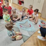 A gondolatok megbeszélése után, kiszínezték a gyermekek a boldogság füzért, és közben elkezdtük a szőnyegen kialakítani a „Boldogság várhoz” vezető, 10 lépcsőfok előkészítését, és a Boldogság vár elhelyezését a lépcsőfokok tetejére. Közösen alakítottuk ki a képet, melynek része volt a mese háttér, a „tűz” a „Szív” a kicsi piros szívekkel és végén a lépcsősor a várral.
