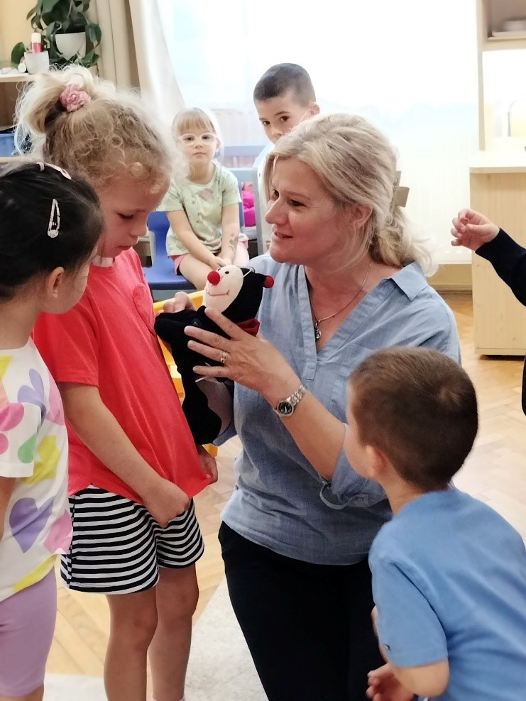 Játékba hívtam őket a szőnyegre és megkérdeztem, hogy mivel érkeztek ma az oviba? Miután mindenki elmondta…, elindítottam (Ikt eszközök használata, mobil és JBL), a „Biciklire szálltam” c. dalt, melyet utánzó mozgással kísértünk végig, figyelve a dal szövegére. Ezután Boldog Dóra, valamint legjobb barátja Peti a Zümi segítségével, egy élménypedagógia játékkal igyekeztem a gyermekek figyelmet magamra, és az általam szervezett kezdeményezésre vonni. Ez sikerült is, hisz a gyermekek teljesen beleélték magukat a játékba. A„Plüsskergetős” játék során a katica és a méhecske kergetőzött, melyet a gyermekek kézről kézre adással oldottak meg. Hosszantartóan játszottuk, és végül a zümi utolérte a katicát. A gyerekek tapsoltak örömükben.