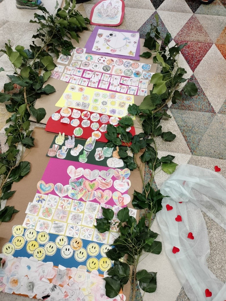 A gondolatok megbeszélése után, kiszínezték a gyermekek a boldogság füzért, és közben elkezdtük a szőnyegen kialakítani a „Boldogság várhoz” vezető, 10 lépcsőfok előkészítését, és a Boldogság vár elhelyezését a lépcsőfokok tetejére. Közösen alakítottuk ki a képet, melynek része volt a mese háttér, a „tűz” a „Szív” a kicsi piros szívekkel és végén a lépcsősor a várral.