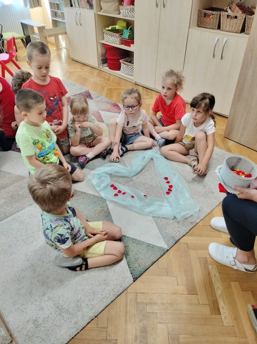 A mesehallgatás után, egy tartalmas beszélgetés kerekedett. Egy hosszú organza anyagból szívet formáltam és minden kisgyermek egy-egy kicsi piros szív elhelyezésével, elmondta, hogy ő mit tud tenni a boldogságért, hogy ő és a környezetében élők, család, barátok, ovis társak….., boldogok lehessenek. Sok kedves ötlet és szívet melengető gondolat fogalmazódott meg, a gyermekek egészen meglepő dolgokat is említettek. Fontosnak tartom a gondolatok megfogalmazásával, a gyermekek kognitív, anyanyelvi -, és elsősorban érzelmi életének fejlesztését.