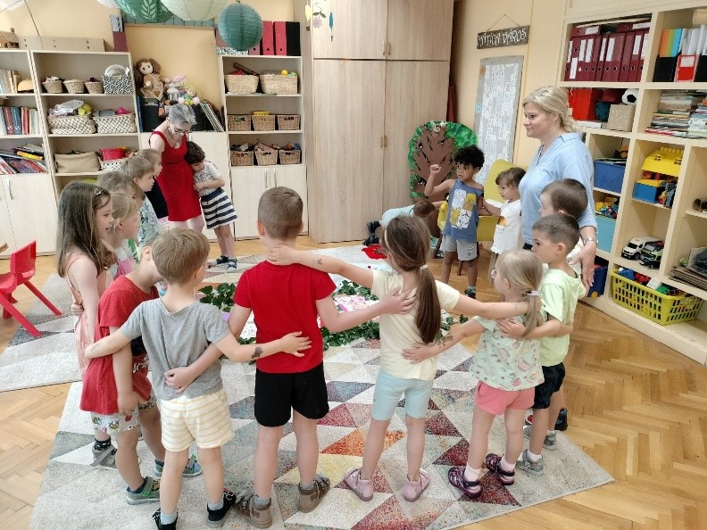 Két-három dalosjátékkal, „Zöld erdőben, zöld mezőben”…, és az „Erdő mellett nem jó lakni”, .. c játékkal fokoztam a hangulatot, mely során alkalom nyílt a társas kapcsolatok fejlesztésére. A párválasztó játék során a választott társ megölelésére, ami szintén az egyik szeretetnyelv, és hozzásegít az öröm fokozásához, a boldogság érzés kialakulásához.