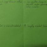 Az osztály frontális megbeszélés során felelevenítette, mi történt velük a tanévben, milyen feladatokat oldottak meg a Boldogságóra Program keretein belül. Együttes erőkkel összegyűjtöttük az összes témát és megvalósítást. Ezután a tanulók egyéni véleményeket alkottak. Négy kategóriában megjelölték a legfontosabb elemeket: mi az, ami pozitív (+) ill. negatív (-) emlék, mit visznek magukkal (zsák), és mitől szeretnének megszabadulni (kuka). Általánosságban legnegatívabbnak az bizonyult, amikor vita támadt a csoportokon belül. Jó élmény volt számukra a társasjáték elkészítése, amivel a hónap osztály díjat is elnyerték. Reméljük, jövőre sikerül erősségeinkre építkezve tovább haladni!