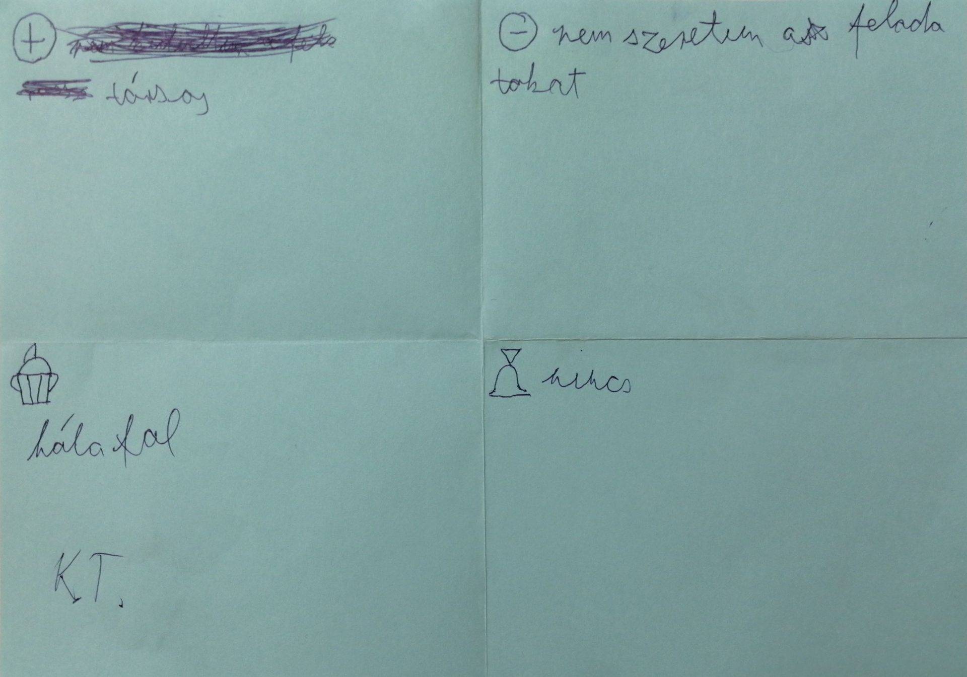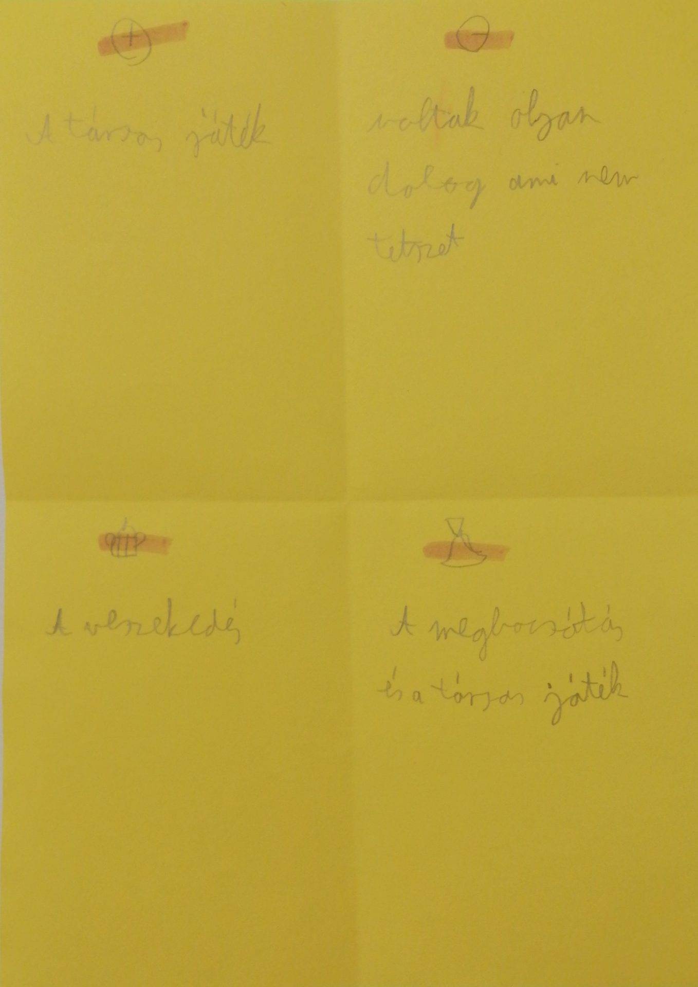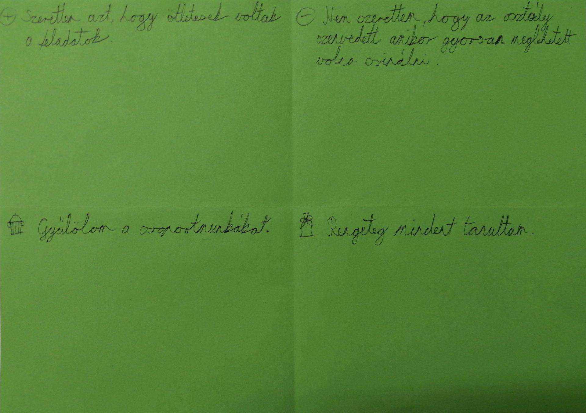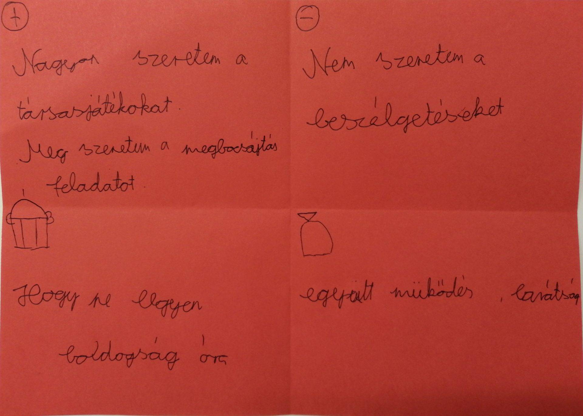 Az osztály frontális megbeszélés során felelevenítette, mi történt velük a tanévben, milyen feladatokat oldottak meg a Boldogságóra Program keretein belül. Együttes erőkkel összegyűjtöttük az összes témát és megvalósítást. Ezután a tanulók egyéni véleményeket alkottak. Négy kategóriában megjelölték a legfontosabb elemeket: mi az, ami pozitív (+) ill. negatív (-) emlék, mit visznek magukkal (zsák), és mitől szeretnének megszabadulni (kuka). Általánosságban legnegatívabbnak az bizonyult, amikor vita támadt a csoportokon belül. Jó élmény volt számukra a társasjáték elkészítése, amivel a hónap osztály díjat is elnyerték. Reméljük, jövőre sikerül erősségeinkre építkezve tovább haladni!