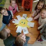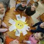 Ezután készítettük el a **„Mosolygós napocskát”**: egy nagy kartonból kivágott nap közepére felírtuk a csoport nevét, a sugarakra a gyerekek rajzolták vagy írták, mi okozott nekik örömet. Minden gyermek egy napsugarat kapott, amit ráragaszthatott a közös napra. A kész „Mosolygós napocska” kikerült a csoportszoba falára, hogy minden nap emlékeztesse a gyerekeket a pozitív pillanatokra.