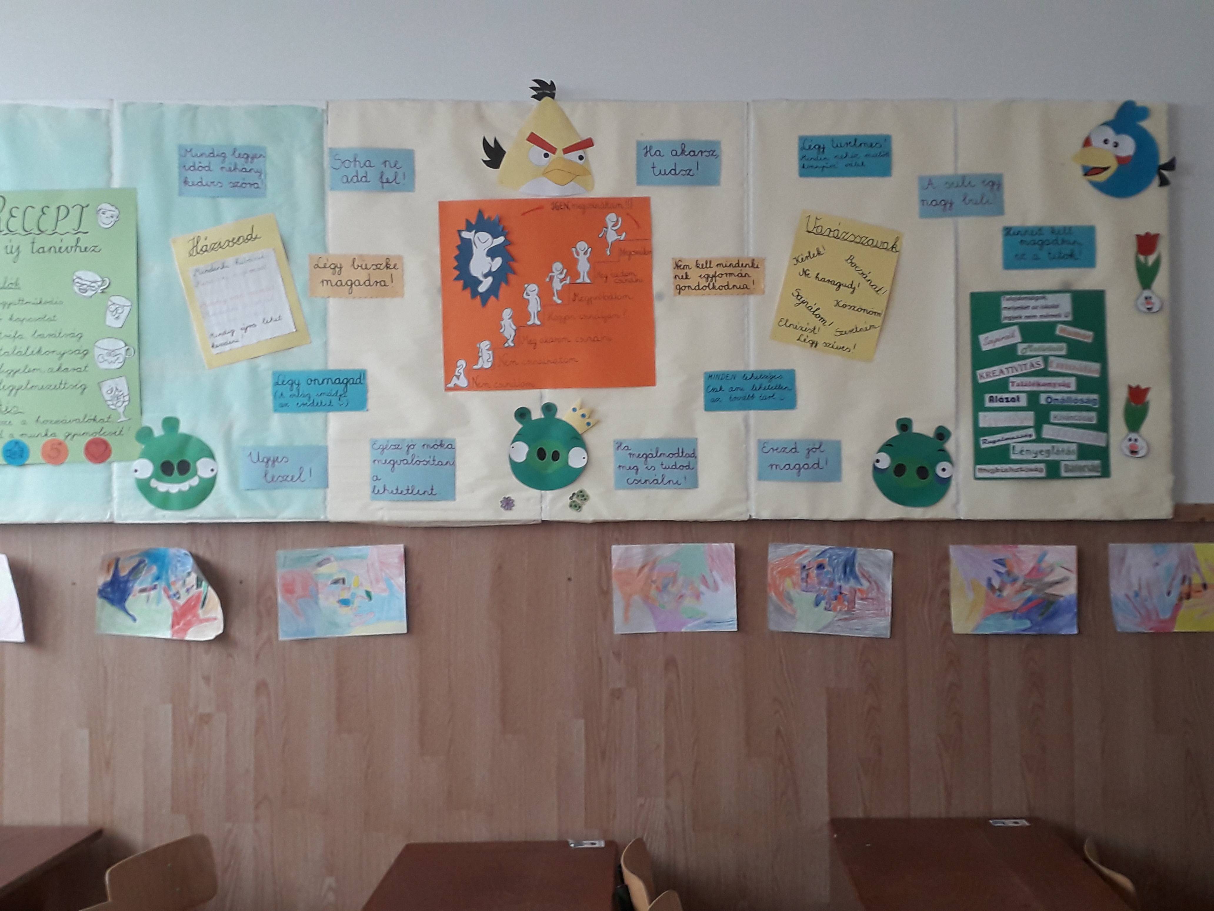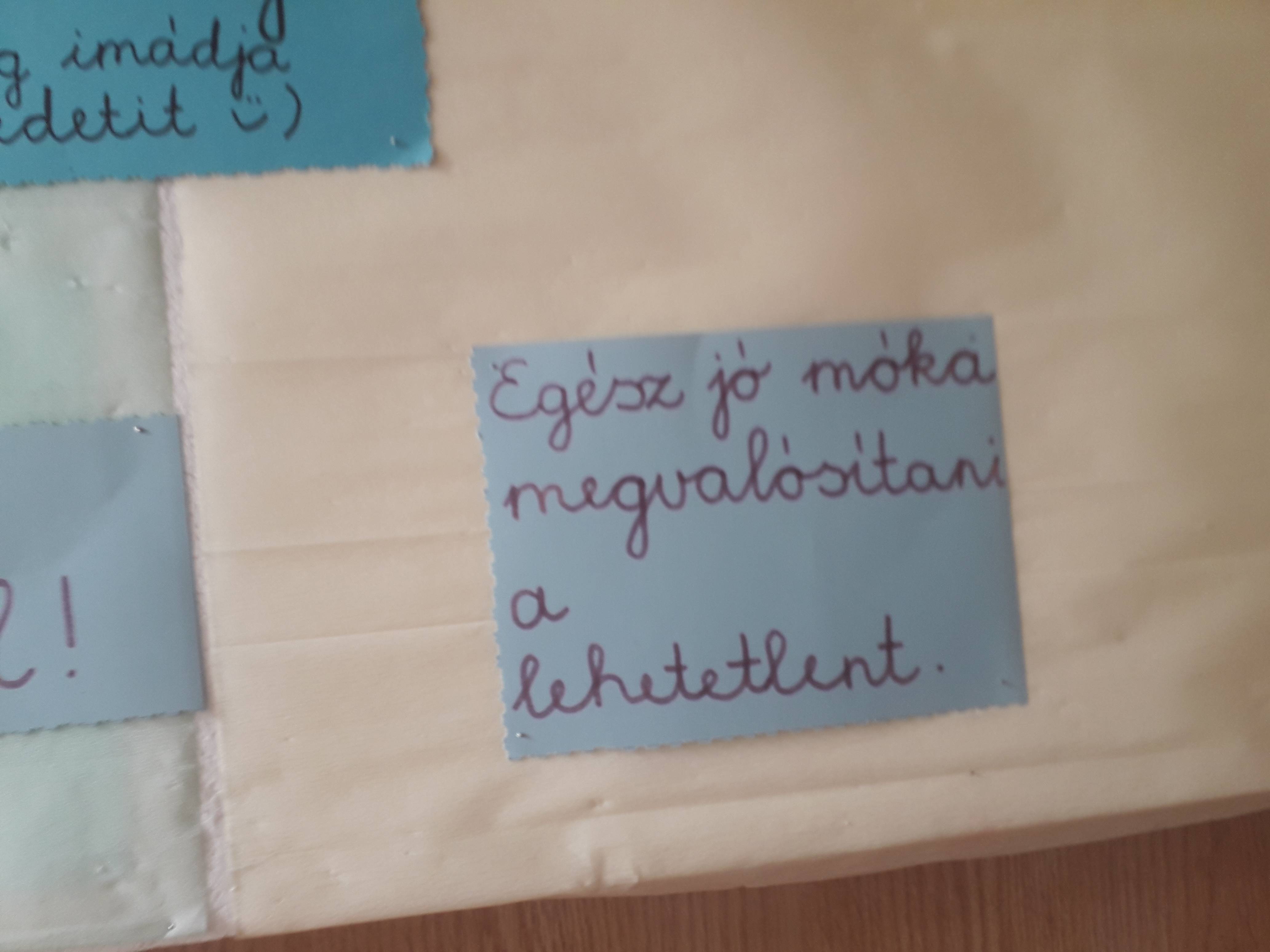 Az osztályfalra csak motivációs idézetek kerülhettek. Ezeket otthonról, netről hozták a gyerekek. Közösen alkottuk, volt, aki nyírt, ragasztott, írt, rajzolt (másolt), díszített, tűzött…