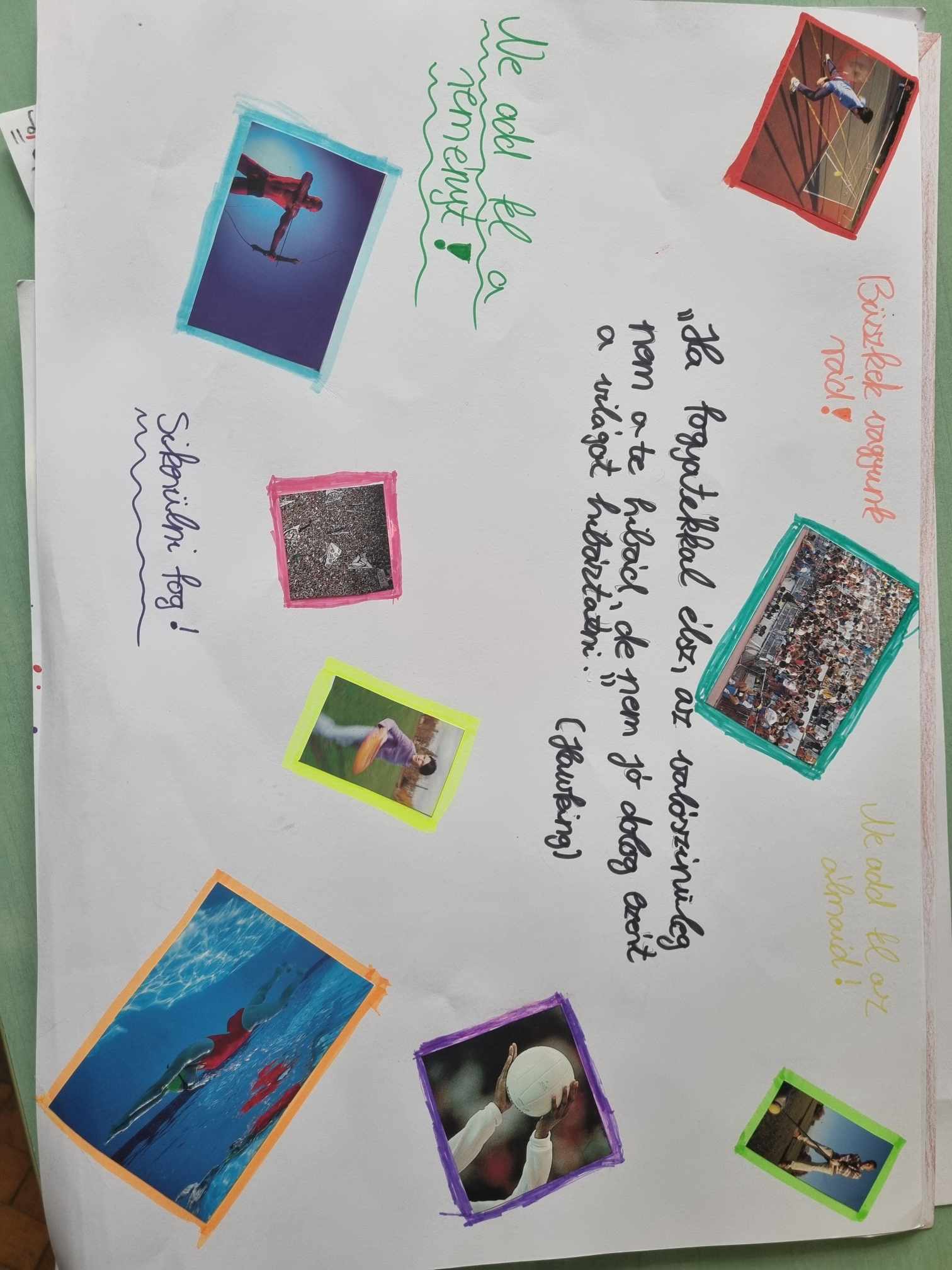 A legmeghatóbb napunk a paralimpia volt. Ezen a napon megismertük a sérült emberek kitartását, küzdését. Mi is kipróbálhattuk magunkat a sportokban. Nem volt könnyű, de igazi összetartozást megerősítő nap volt.