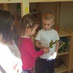 Az ősz színeinek felsorolása közben egy igazi falevelet is találtunk. A falevél nagyon sok játékot rejtett magában. Csiklandozása, simogatása jókedvre derítette a gyermekeket.