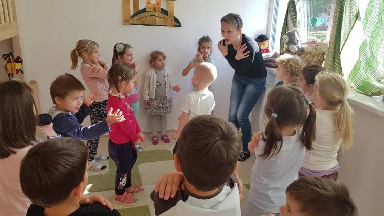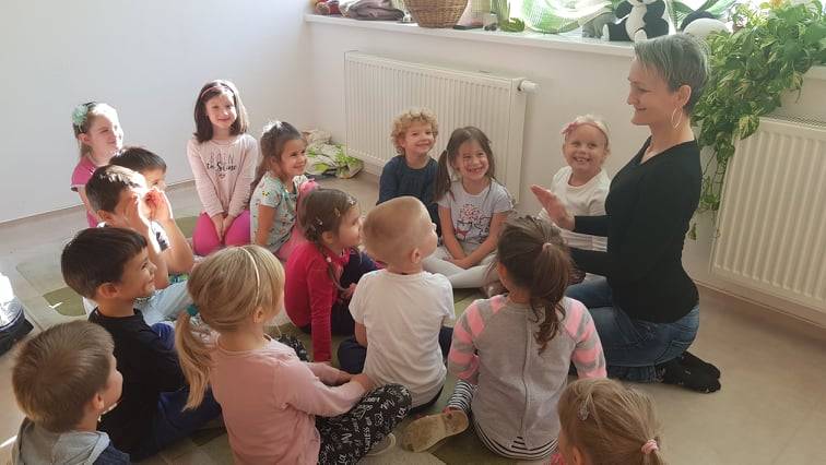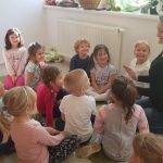 A gyermekekkel egy átmozgató kis torna után képzeletbeli faleveleket gyűjtöttünk képzeletbeli kis kosárkába.