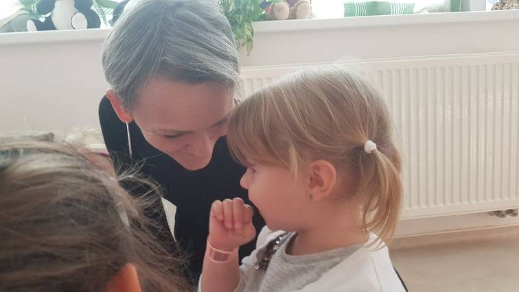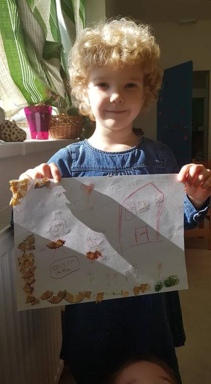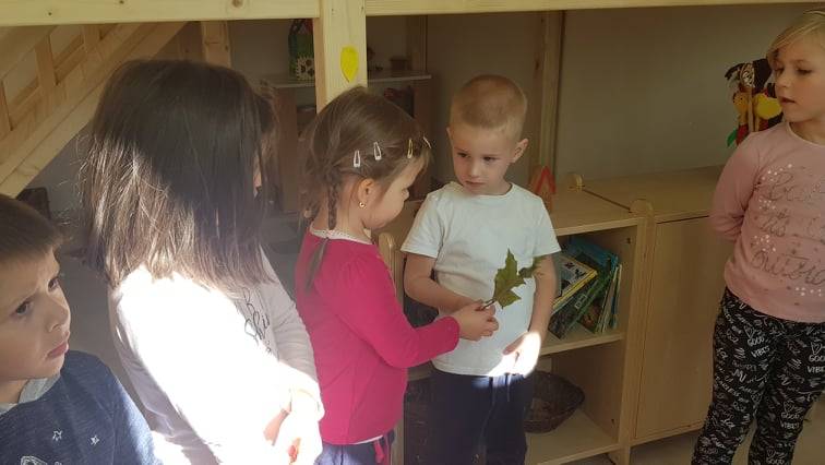 Az ősz színeinek felsorolása közben egy igazi falevelet is találtunk. A falevél nagyon sok játékot rejtett magában. Csiklandozása, simogatása jókedvre derítette a gyermekeket.