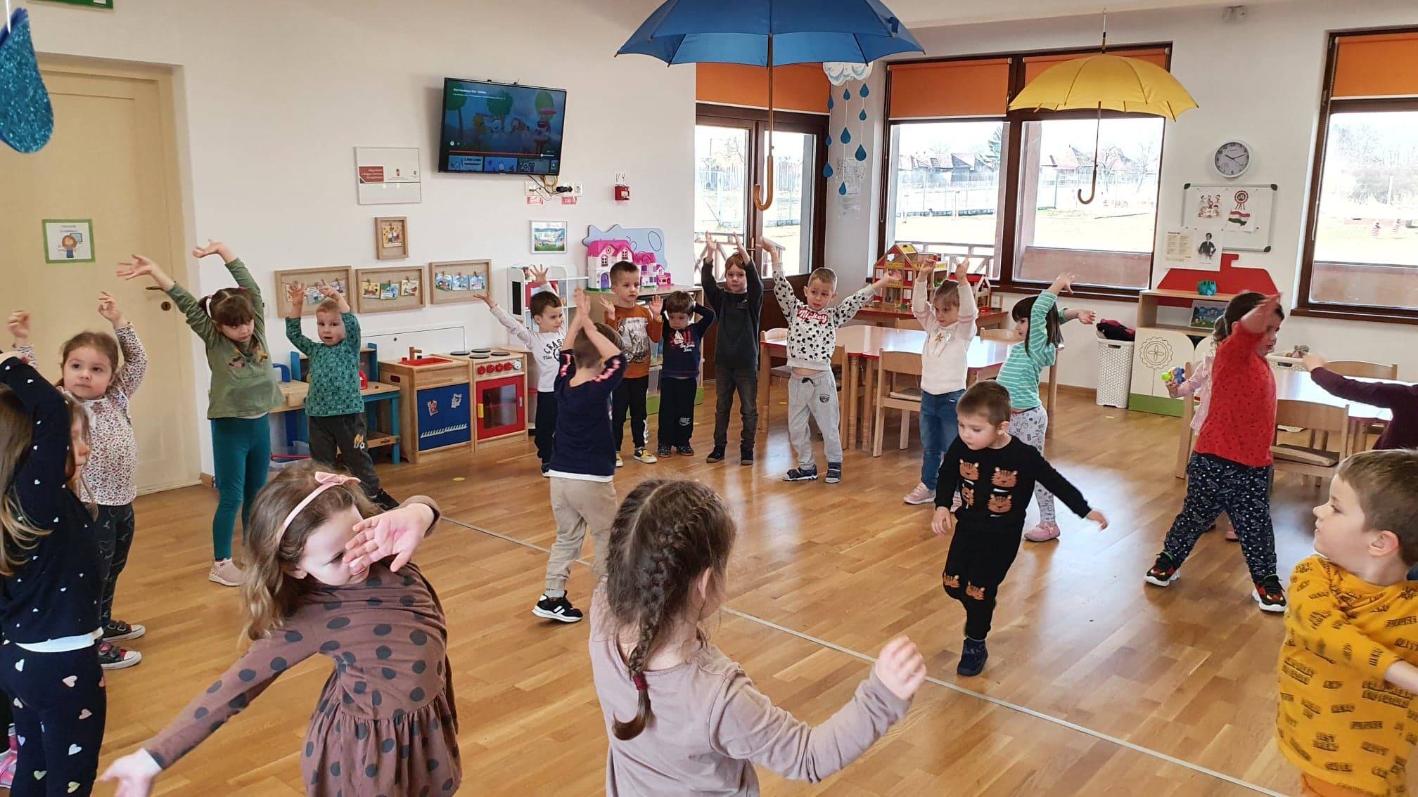 A tevékenység lezárásaként a Kicsi Gesztenye Klub „Esőtánc” című dalára táncoltunk, azaz zenére sétáltunk a teremben. Amikor a zene megállt és az óvónő elkiáltotta magát, hogy „Hurrá, esik az eső!”, akkor abban a pillanatban kinyitott egy piros, sárga vagy kék esernyőt. A gyermekeknek azalá a plafonra felfüggesztett esernyő alá kellett szaladniuk, amilyen színűt láttak az óvónő kezében kinyitva. Ha az óvónő elkiáltotta magát, hogy „Hurrá, szivárvány!”, akkor a gyerekek alászaladtak az ő szivárvány színű esernyője alá. A zene újbóli megszólalásakor, a gyermekek ismét sétáltak, a „Tánc, tánc, tánc, esőtánc” refrénre pedig táncoltak és forogtak a teremben.
