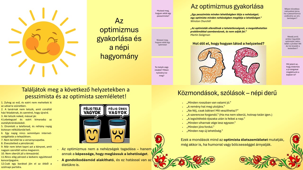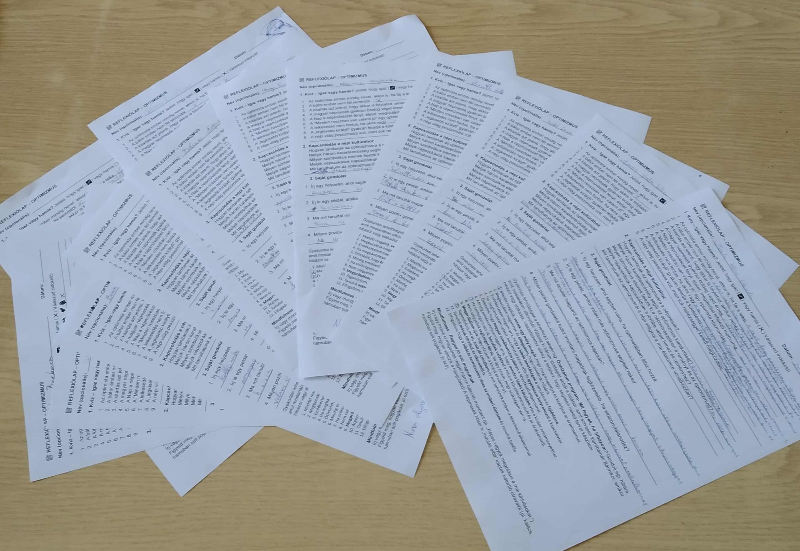 Ezután párokban előadták, hogy mik lehetnek a pesszimista és az optimista reakciók azokban a szituációkban, amik az Optimista reakciók című feladatban voltak felsorolva. Ismét összegeztük, hogy a feladatból is nyilvánvaló, hogy rajtunk múlik, hogy miként értékeljük azt a szituációt, amiben vagyunk. S ha valakinek nehezebben áll rá az agya a pozitív gondolkodásra, ezt gyakorlással alakítani tudja.