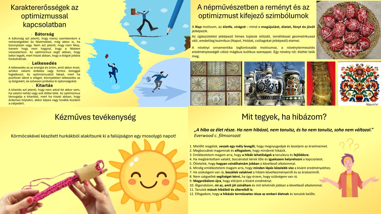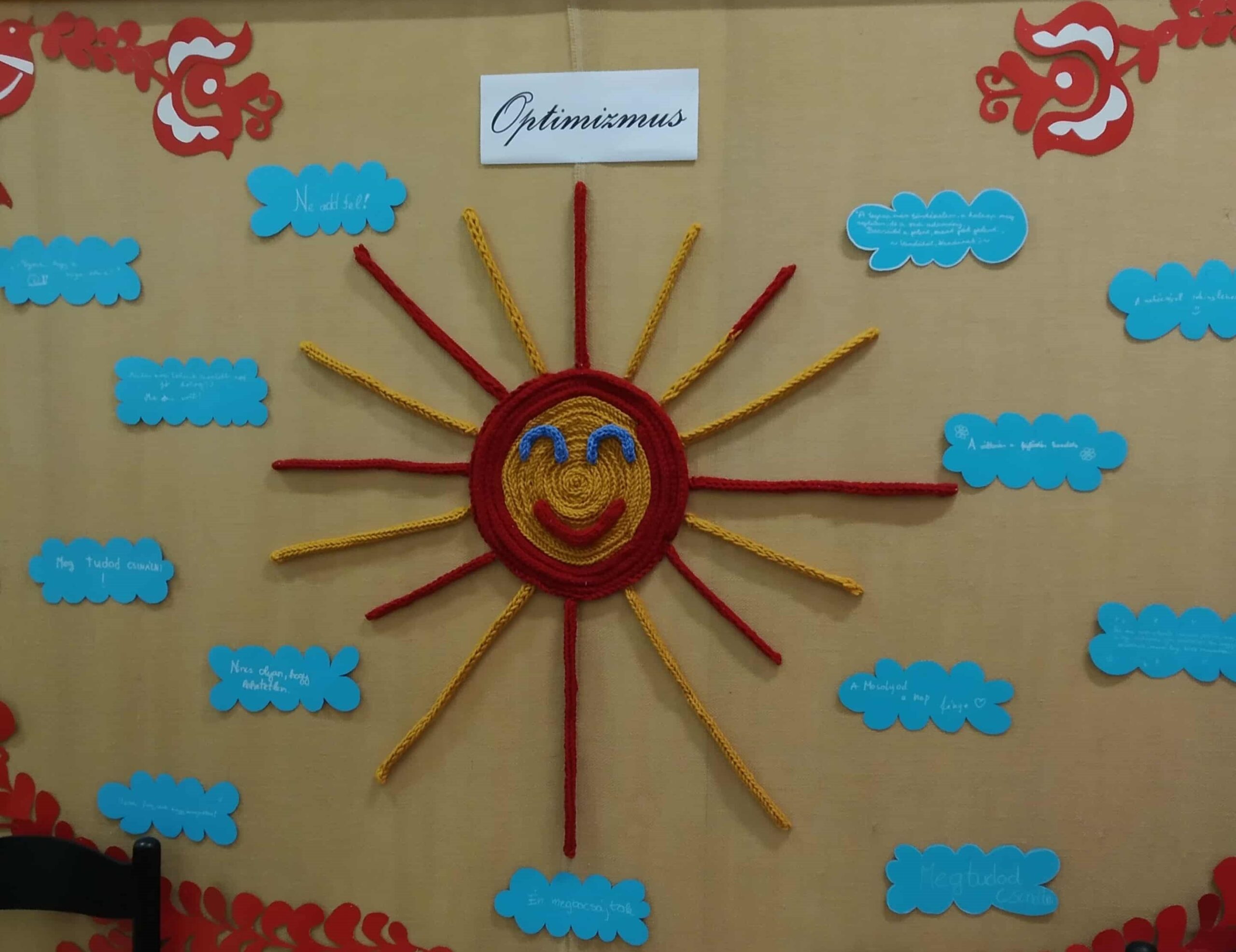 Ezt követően a népművészetben a reményt, a megújulásban való hitet, a pozitív jövőképet kifejező szimbólumokat kerestük. Ezek közül a Napot alkottuk meg faliújságunkra közösen, úgy, hogy mindenki készített körmöcskével fonalhurkákat, s ebből állítottuk össze a mosolygó Napot, majd köré raktuk a korábban a felhőkre írt optimizmusra bíztató gondolatokat.