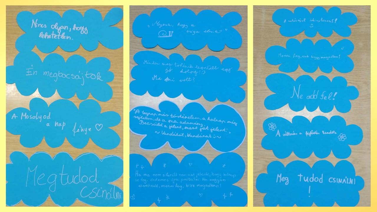 Ezt követte a közmondások vizsgálata, láttuk, hogy ezek is alapvetően pozitív életszemléletet tükröznek. Majd bárányfelhőket vágtak ki és fehér filccel optimista üzeneteket írtak rá. Ezeket is kitettük a faliújságra.