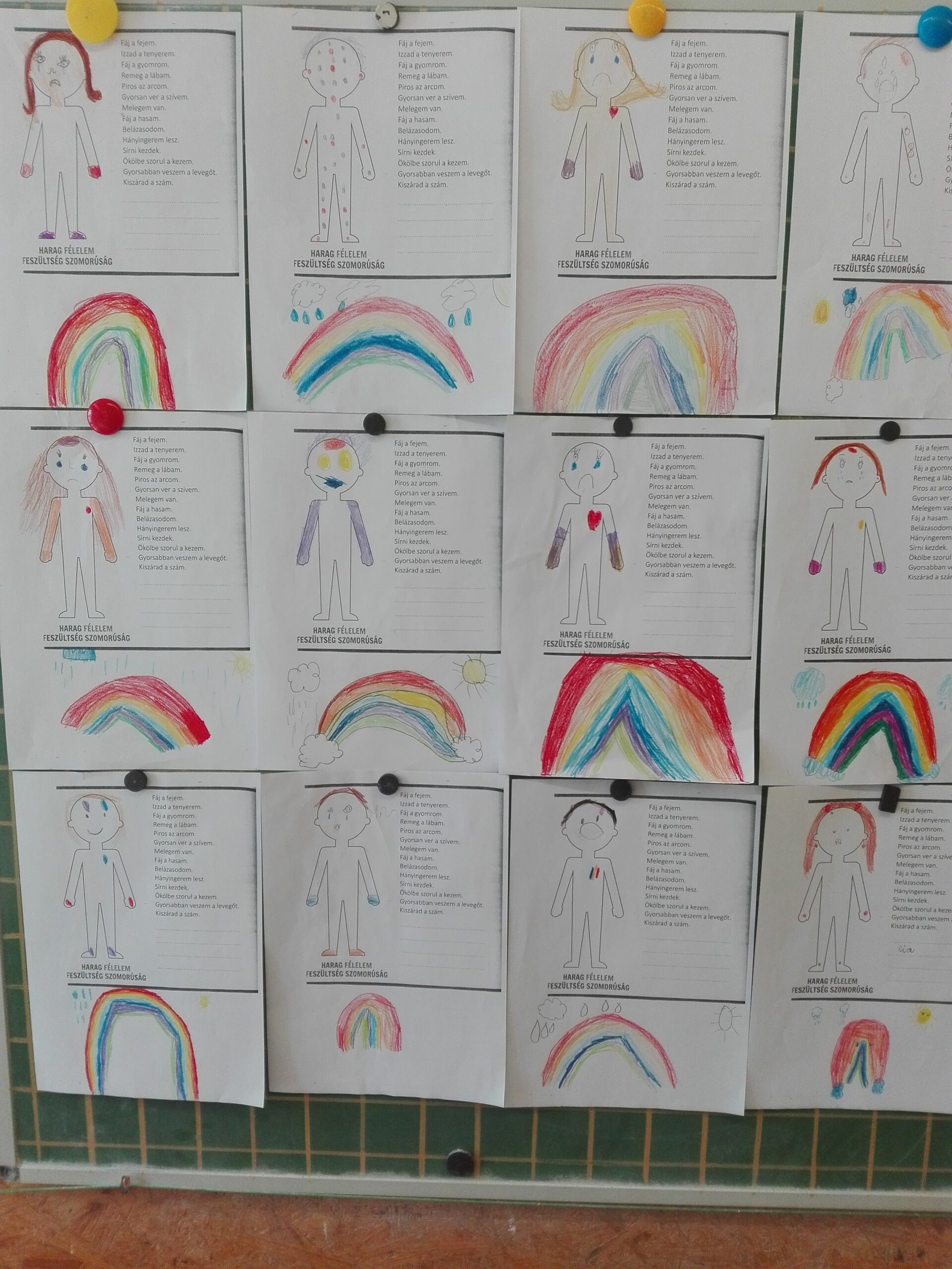 A témához kapcsolódóan A bugyelláris, a pipa meg a süveg című mese meghallgatása, megbeszélése következett. Ezután feszültség rajz készült. Játékkal zárult az óra. A gimnasztika csukott szemmel és a vak kígyó játék jó alkalom volt a feszültségek oldására.