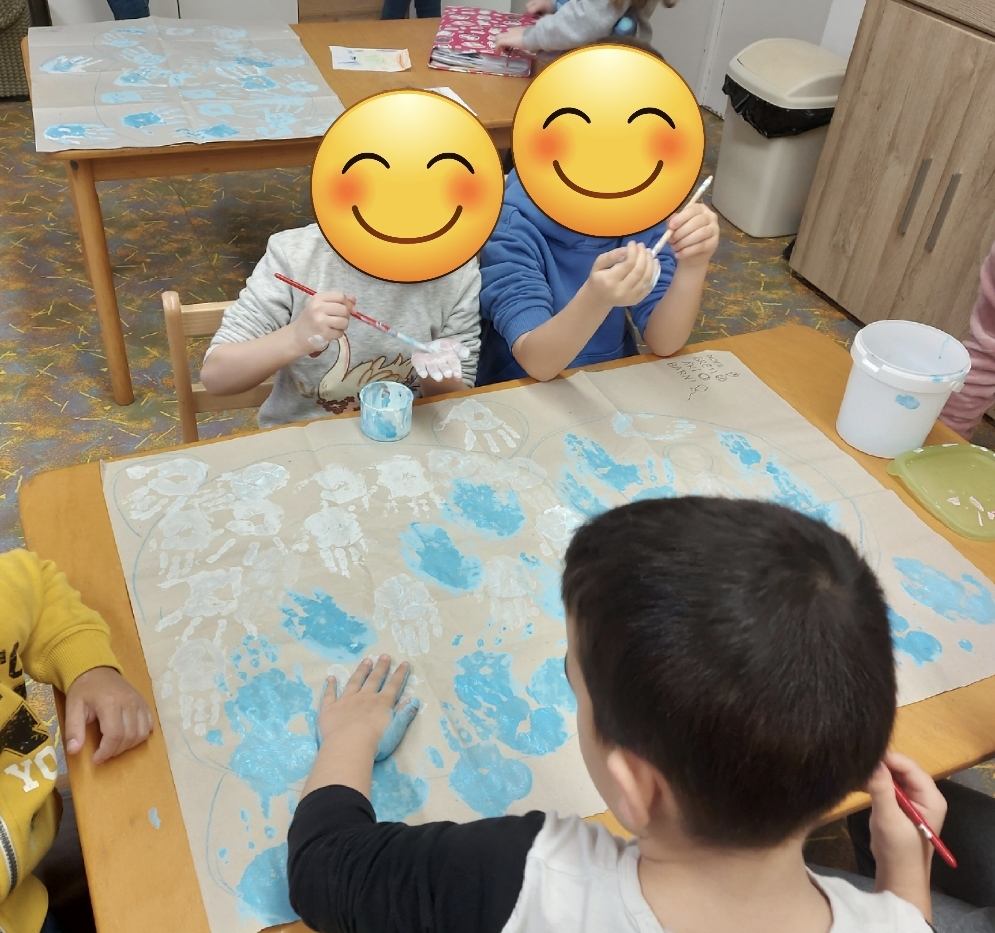 Egy előkészített csomagolópapírra elkészítettük a csoport hóemberét is festék és ecset segítségével.