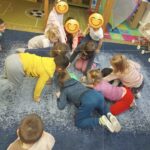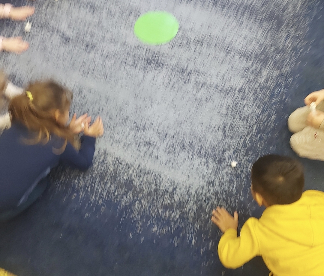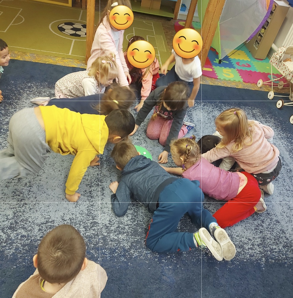 Közös játék: Hópehelyfújás. Minden gyermek kapott egy szalvétát, amit kedve szerint gombóccá gyúrhatott. A meseszőnyeg közepére egy körlapot helyeztem el, amire a „hópelyheket” fújhatták. Többször is megismételtük. Amikor ez már jól ment, 3 körlapból formáltam nekik hóembert. Ide kellett a saját gombócokat ráfújni úgy, hogy a többi ne mozduljon el a helyéről. Ezt a játékok nem egyszerre, hanem egymás után végezték a gyerekek. Egymásnak szurkolva, koncentrálva az egyéni feladatra, a nekem is sikerült érzést erősítve bennük.