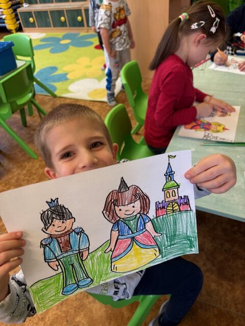 A kicsiknek sárkány képet adok amiket kifesthetnek.