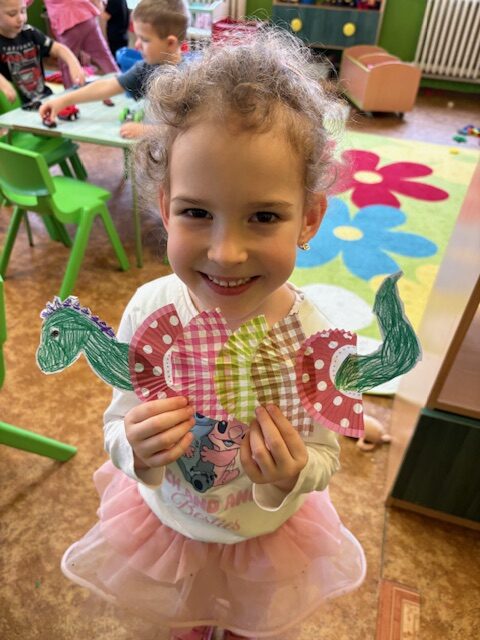 Eszközök: olló, ragasztó, muffin papírok, sárkány fej és farok, színesceruák, hurkapálcák.