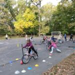A ligetben a diákok kerékpáros és rolleres akadálypályán próbálhatták ki ügyességüket. A pálya izgalmas feladatokkal várta őket: kanyarok, szlalom, egyensúlyozás és „megállj!” pontok tették próbára a résztvevők figyelmét és mozgáskoordinációját.