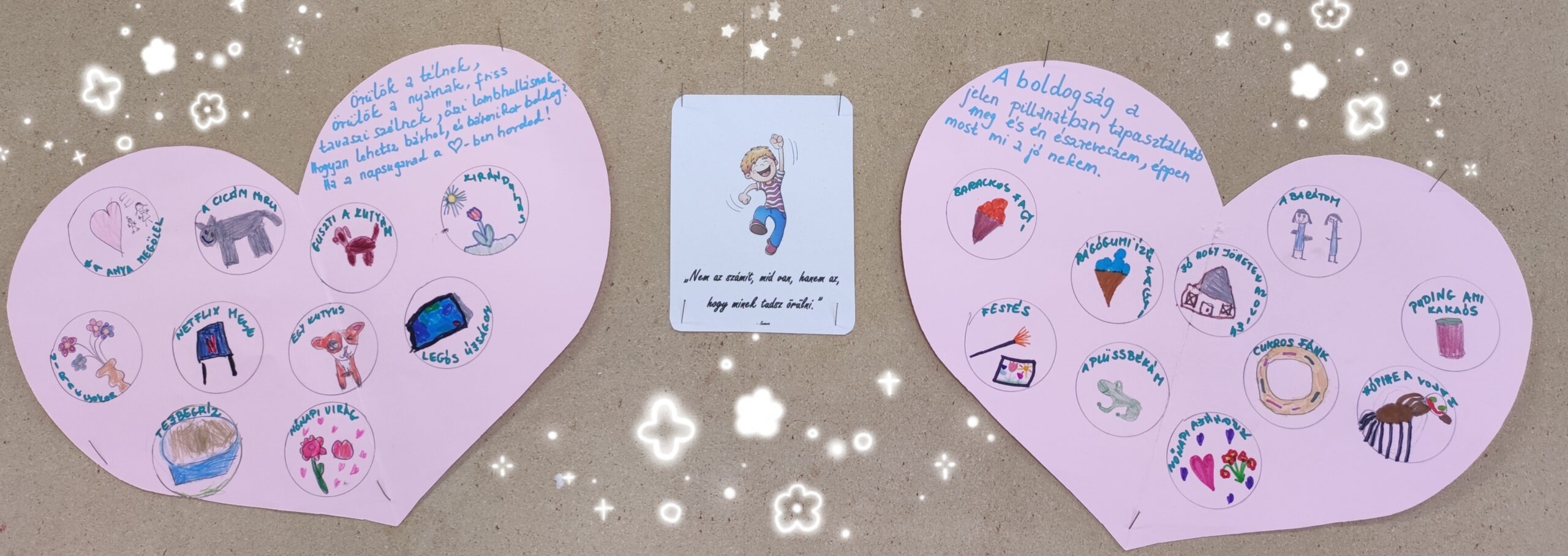 A zene oldott hangulatot hozott. Meghallgattuk Bagdi Bella: Ha boldog vagy, mutasd meg mindenkinek c. dalát. Készítettünk két nagy szívet, amelyekbe összegyűjtöttük a boldogságot hozó dolgokat, majd a gyerekek rajzban is kifejezték az ezzel kapcsolatos érzéseiket. Megfigyeltük és megbeszéltük a rövid ideig tartó, múló örömök és a tartósabb boldogság közötti különbségeket.