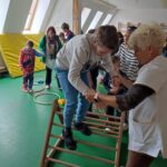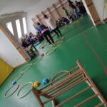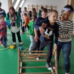 Akadálypályát készítettünk a mozgásteremben. Az akadálypályán sok gyerekünk csak segítséggel tudott átjutni. Előtte beszélgettünk arról, mi a teendő, ha az utcán egy fehér bottal közlekedő emberrel találkozunk, hogyan segítünk neki, mi a teendőnk. Kinek tudunk mi a segítségére lenni. Ezután megbeszéltük, hogy közülünk is sokan segítségre szorulnak, de meg kell tanulniuk kitől kaphatnak támogatást. Az akadálypályán a felnőttektől kaptak segítséget, támogatást. A szemüket nem kötöttük be, a bizonytalanságukat így is ellensúlyozni kellett.