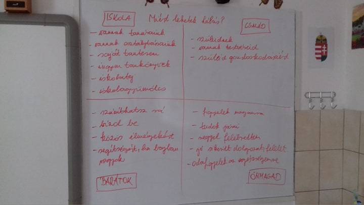 A melléklet segítségével arról beszélgettünk, miért lehetünk hálásak a következő négy területen: iskola, család, barátok, önmagunk. Közösen gondolkodva, a táblára összegeztük, felírtuk a legfontosabbakat.(lásd fotó)