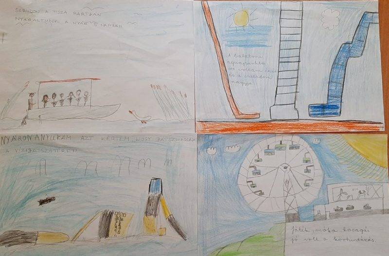 A gyerekek nagyon élvezték a nyári élmények felelevenítését. Nagyon hálásak a szüleiknek az élményekért. Ügyesen próbáltak rövid rímelő sorokat kitalálni rajzaikhoz.