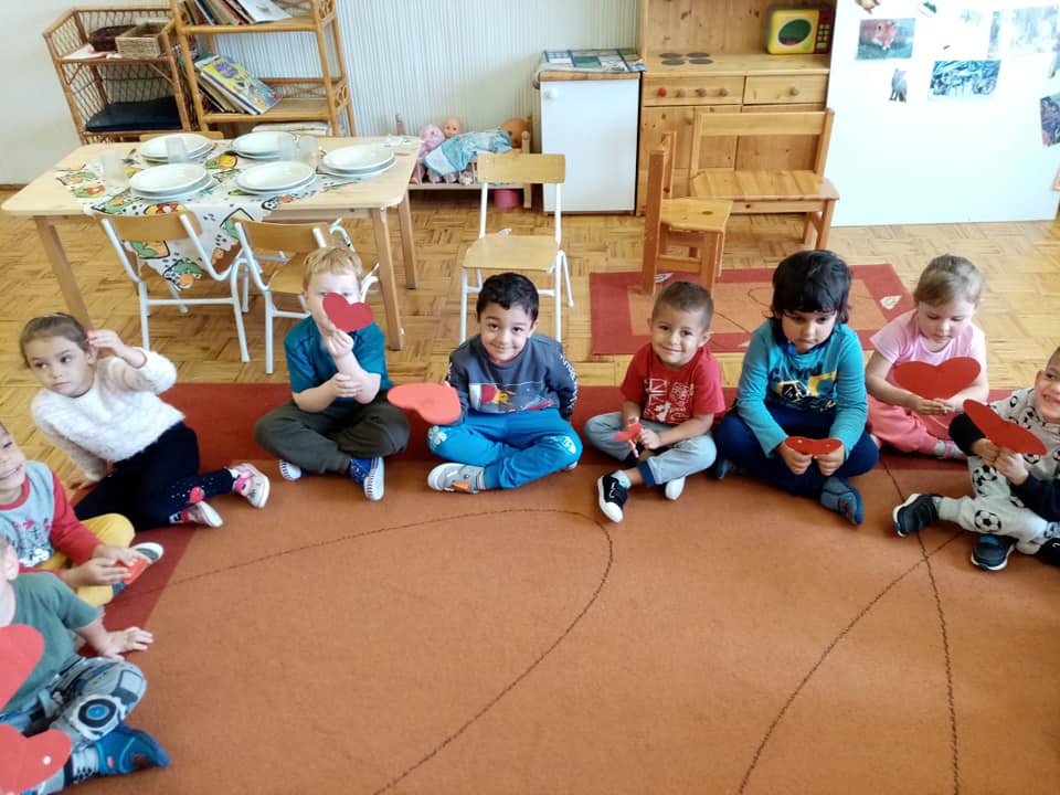Szervusztok! Megbeszéltük a gyermekekkel mennyire hiányzott ebben az Covidos időszakban az óvoda. Szívecskék cseréje ki miért hiányzott, ki kit szeret a legjobban. A szeretetről tanultunk egy dalt, amit még nem értelmeztek a gyerekek de a közös éneklés nagyon jó hatással volt a csoportra.