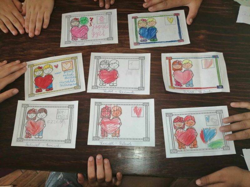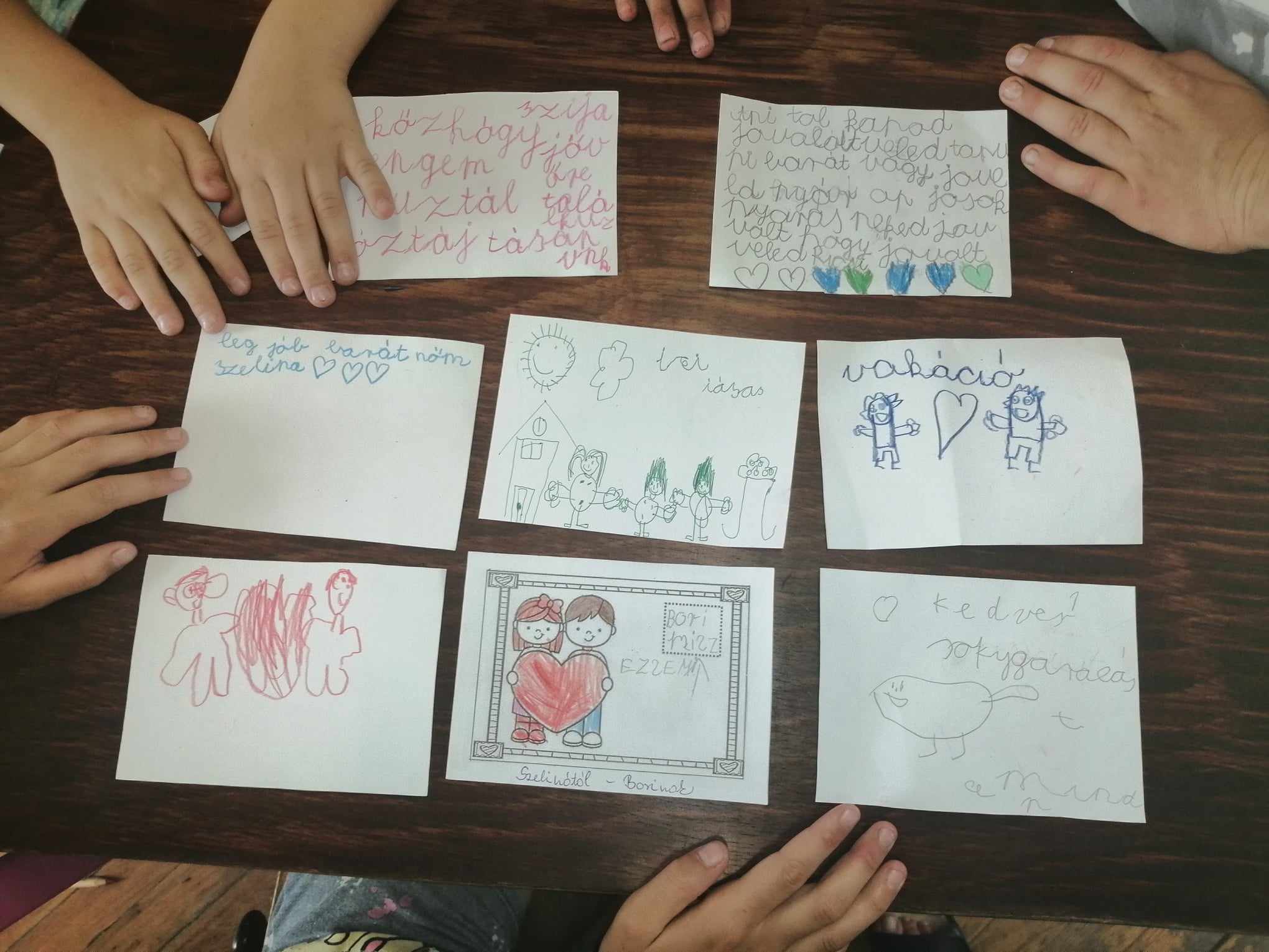 A nyári szünet öröme mindig magában hordozza az elválást is a vakáció idejére, ezért jókívánság képeslapokat készítettek a gyerekek egymásnak. Kis papírokra írtuk a csoporttagok neveit, és mindenki kihúzta egy társát, akinek szép és kedves dolgokat írhatott, rajzolhatott a képeslapjára. Magam is meglepődtem mennyire komolyan vették a gyerekek a feladatot és nagy szeretettel, gondossággal készítették a jókívánságokat egymásnak, majd az átadás is nagyon személyesre sikerült. Mindenki kíváncsian olvasta, silabizálta, őrizte, a neki szánt jókívánságot és a nap végén haza is vitték a gyerekek.
