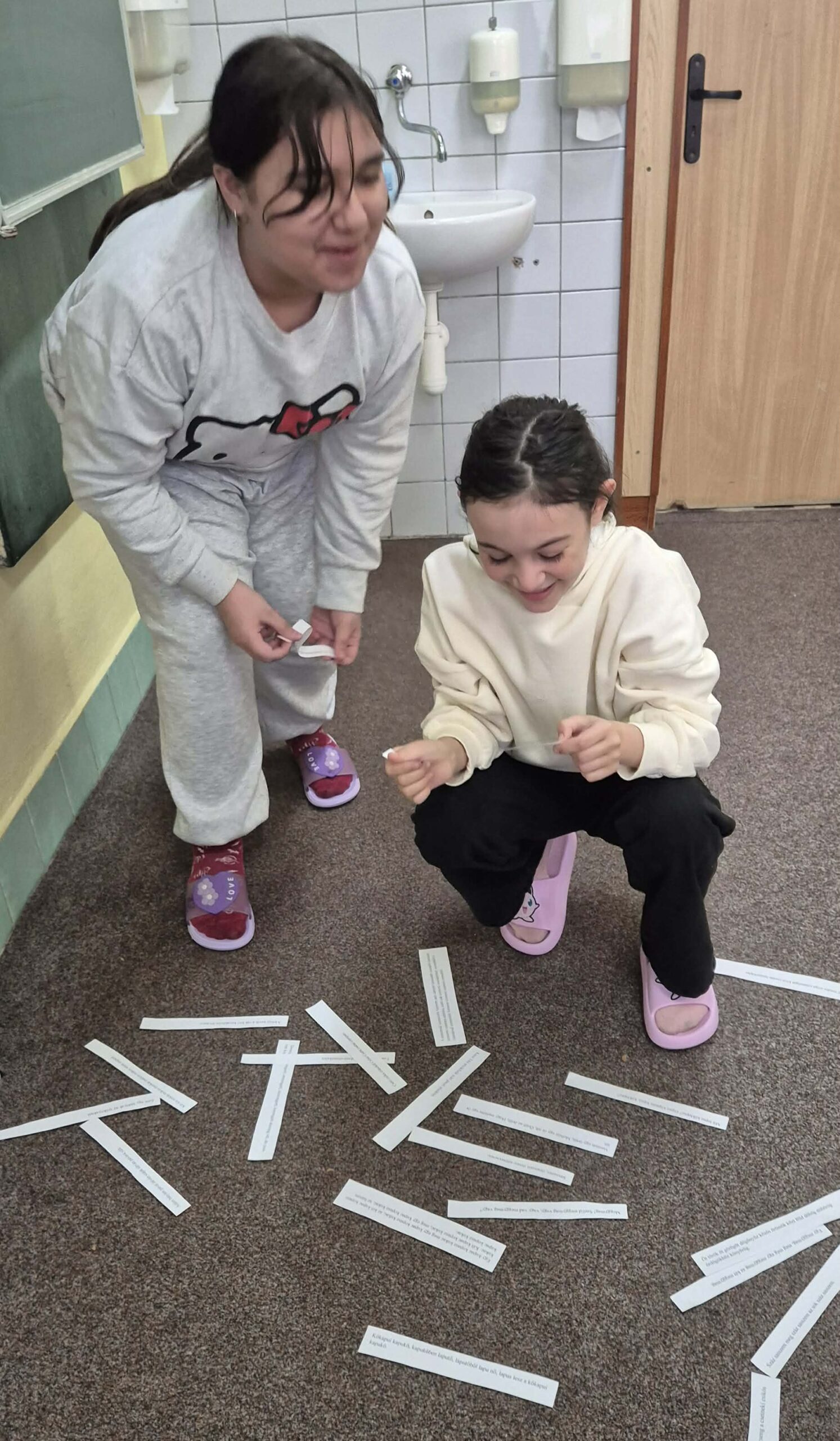 Összegyűjtöttünk jópár érdekes, vicces, nehéz nyelvtörőt. Mindenki eldönthette, milyen módszerrel, melyik teremben fog a feladathoz, hogy küzd meg vele, milyen stratégiát választ. Néhányan leültek a sarokba, sétáltak, lefeküdtek a szőnyegre. A tanuláshoz többféle módszert használtak, volt aki csak csendben a szemével olvasta és tanulta, volt aki halkan mantrázta a szöveget és voltak, akik hangosan egymással gyakorolva mondták. Nehéznek indult a feladat, mert volt bizonyos időkeret, de mindenki megküzdött a feladattal és jókat derülve egymás nyelvtörőjén zártuk a boldogságórát.