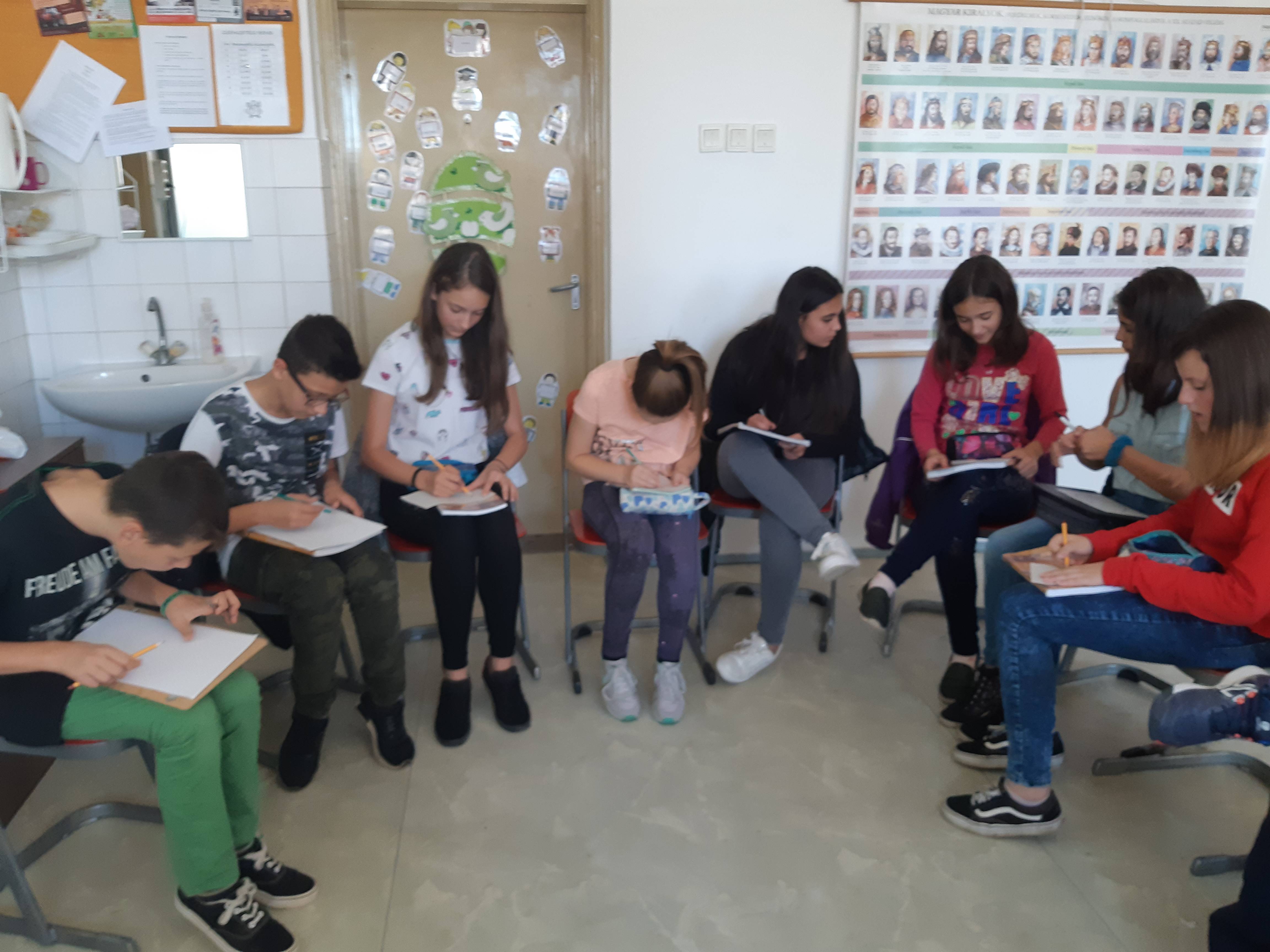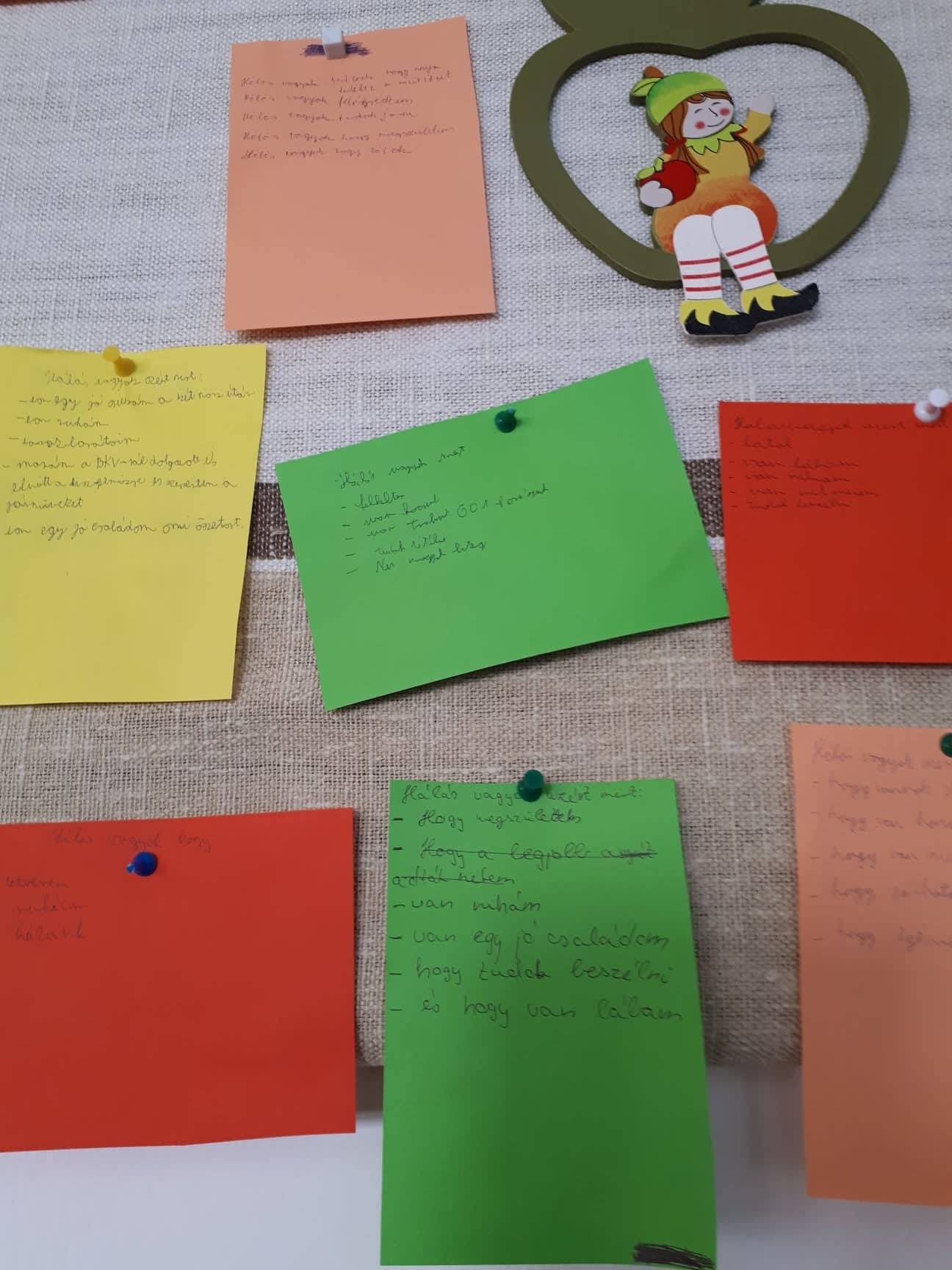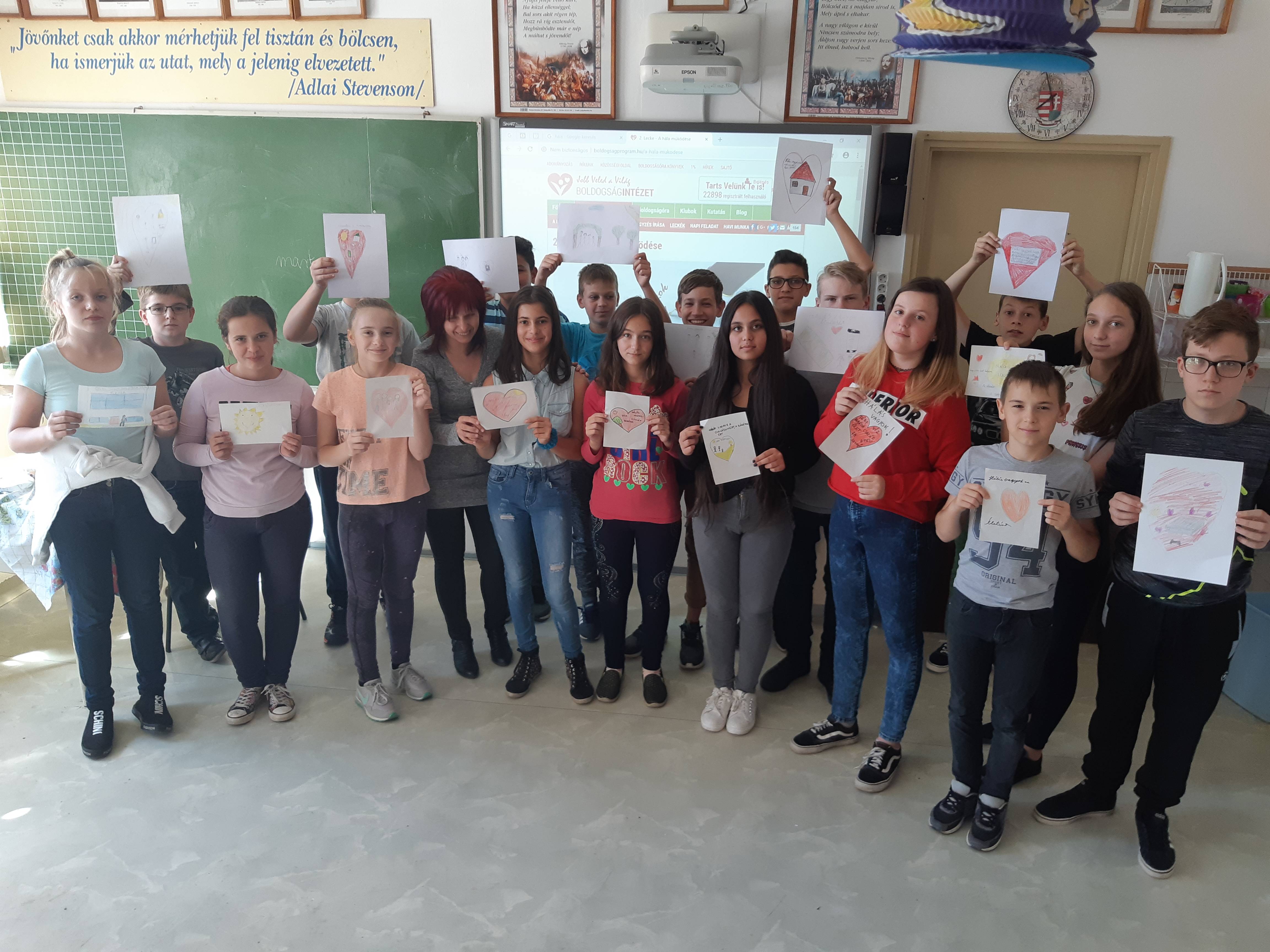 Izgatottan vártuk az első Boldogság óránkat, hiszen előzetes tapasztalataink nem voltak. Az óránk motivációjaként megnéztünk egy videó filmet egy Csernobilból megmenekült nőről,aki ebben a tragédiában gyerekként elveszítette az egész családját és hosszas szenvedés után mégis jóra fordult az élete. A filmben megfogalmazta a hálát, amit a viszontagságok ellenére is érzett. A gyerekekkel megbeszéltük a film üzenetét és azt, hogy mit jelent a hála az ő életükben. Lerajzolták és leírták, hogy ők miért hálásak. Végezetül egy történetet olvastuk fel, amelynek a tanulsága, hogy minden rosszban észre kell vegyük a jót is. Az óra kellemes hangulatban telt, és megmutatta számunkra, hogy érdemes folytatnunk a Boldogság órákat, mert a gyerekek szívesen és aktívan kapcsolódtak be a beszélgetésbe.