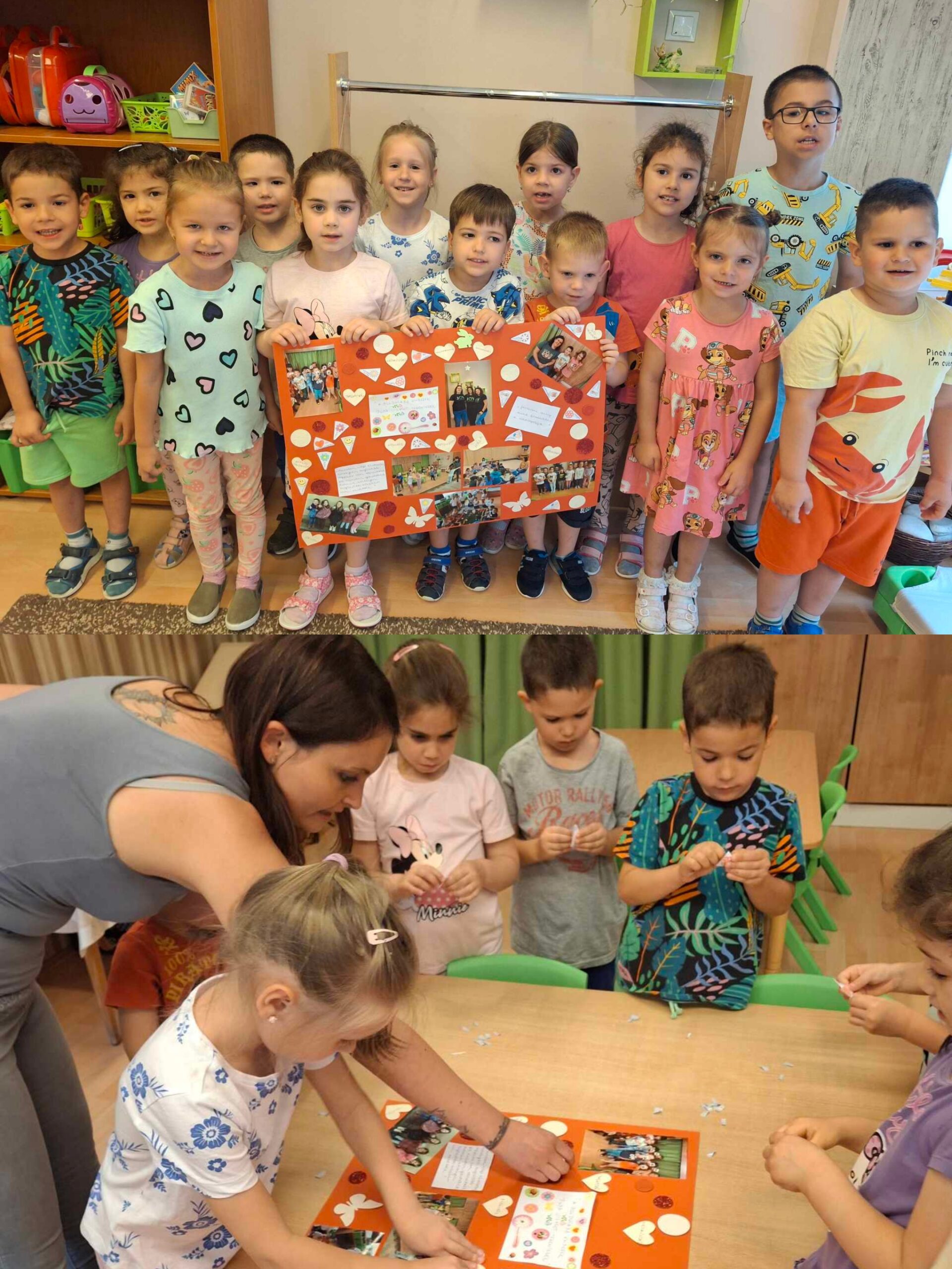 Zárásként emlék tablót készítettünk, ahol megjelenítettük a 10 hónap pici ábráját. Közös fotókkal, szívekkel díszítettük. A sok közös élmény, szeretetteljes pillanat megjelent egy karton papíron, amit mi töltöttünk meg érzésekkel. Felelevenítettük a közös emlékeket, megbeszéltük, melyik mikor történt és épp mit csináltunk, amikor a kép készült. A gyerekek szívesen nézték vissza magukat, örömmel meséltek a képről. A szülők olyan idézeteket hoztak a tablóra, ami számukra a boldogságot a legjobban tükrözi.