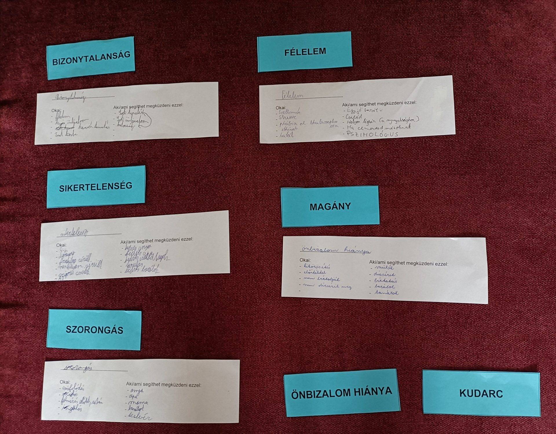 – helyzetek és érzelmi állapotok, melyekkel meg kell küzdenünk: 7 kártyából választanak szabadon a tanulópárok ill. csoportok, a kártyákon különféle nehézségek (félelem, magány, önbizalom hiánya, stb.)