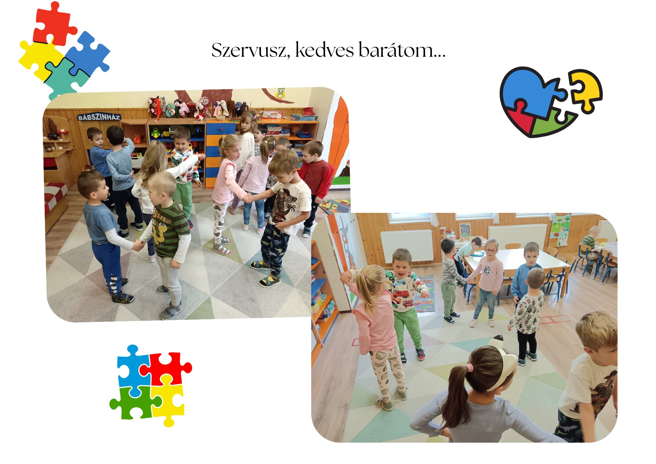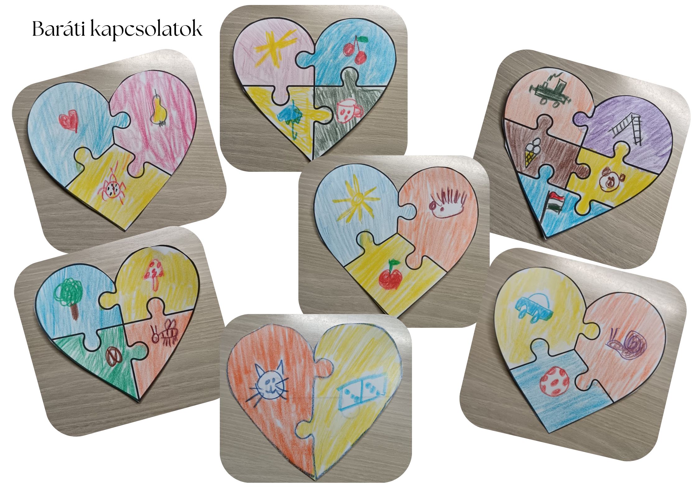 A kapcsolatteremtést, kapcsolattartást gyakoroltuk a „Kis barátom, hogy vagy?” szituációs játékkal; a „Szervusz, kedves barátom” dalos párválasztó játékkal és a „Szigetjátékkal”, valamint változatos megszólítás, kérés, segítségkérés, felajánlás formáinak összegyűjtésével. Empatikus képességük fejlesztését a „Szomorú Szilárd és Boldog Blanka” szituációs játékkal, valamint érzelmeket kifejező „Változó arc” társasjátékkal gyakoroltuk. Az együttműködésre is számtalan pillanat adódott, pl. az „Add előre” játék során, vagy az udvaron naponta játszott „Adj király katonát” játékokkal. Konfliktusok esetén békés megoldások keresésére, valamint érzéseik megfogalmazására tanítottuk és ösztönöztük a gyerekeket. A mindennapok során törekedtünk a pozitív kommunikációra, a kedvesség, dicséret, köszönet kifejezésére. Kapcsolatépítő körjátékokat játszottunk, mint a „Barátságfonal” (fonalat adtunk körbe, és mindenki mondott valami kedveset arról a kisgyerekről, akinek adta), valamint a „Köszönöm kör” (mindenki köszönetet mondott valamiért egy társának). A baráti kapcsolatokról remek képet adtak a „Szív puzzle”-k.