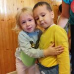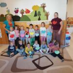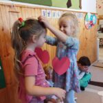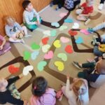Az Alma együttes-Mutasd meg című dalával hangolódtunk a tevékenységre. Elmutogattuk a dalszöveget, szívet formáltunk az ujjainkkal, mosolyt varázsoltunk az arcunkra, megölelgettük magunkat, majd az égbe emeltük a kezeinket. Ez kellőképpen meghozta a jókedvet a csoportba. Egy nagy körbe leültünk a szőnyegre és a kör közepén papírszíveket helyeztünk el. A feladat az volt, hogy egy gyerek válasszon egy szívet magának, keresse meg a párját és akassza annak a nyakába, aki kedves a számára, akit szeretne megölelni, vagy éppen szeretné szebbé varázsolni a napját. Ezt addig csináltuk, amíg mindenkinek került szív a nyakába, végül jól megölelgettük egymást. Nagyon érzelemdús és megható volt látni, hogy a gyerekek megértették, azt hogy egy apró gesztus elég ahhoz, hogy valakinek jobb legyen a kedve, boldogabb legyen, hogy más legyen a hangulata, látásmódja.