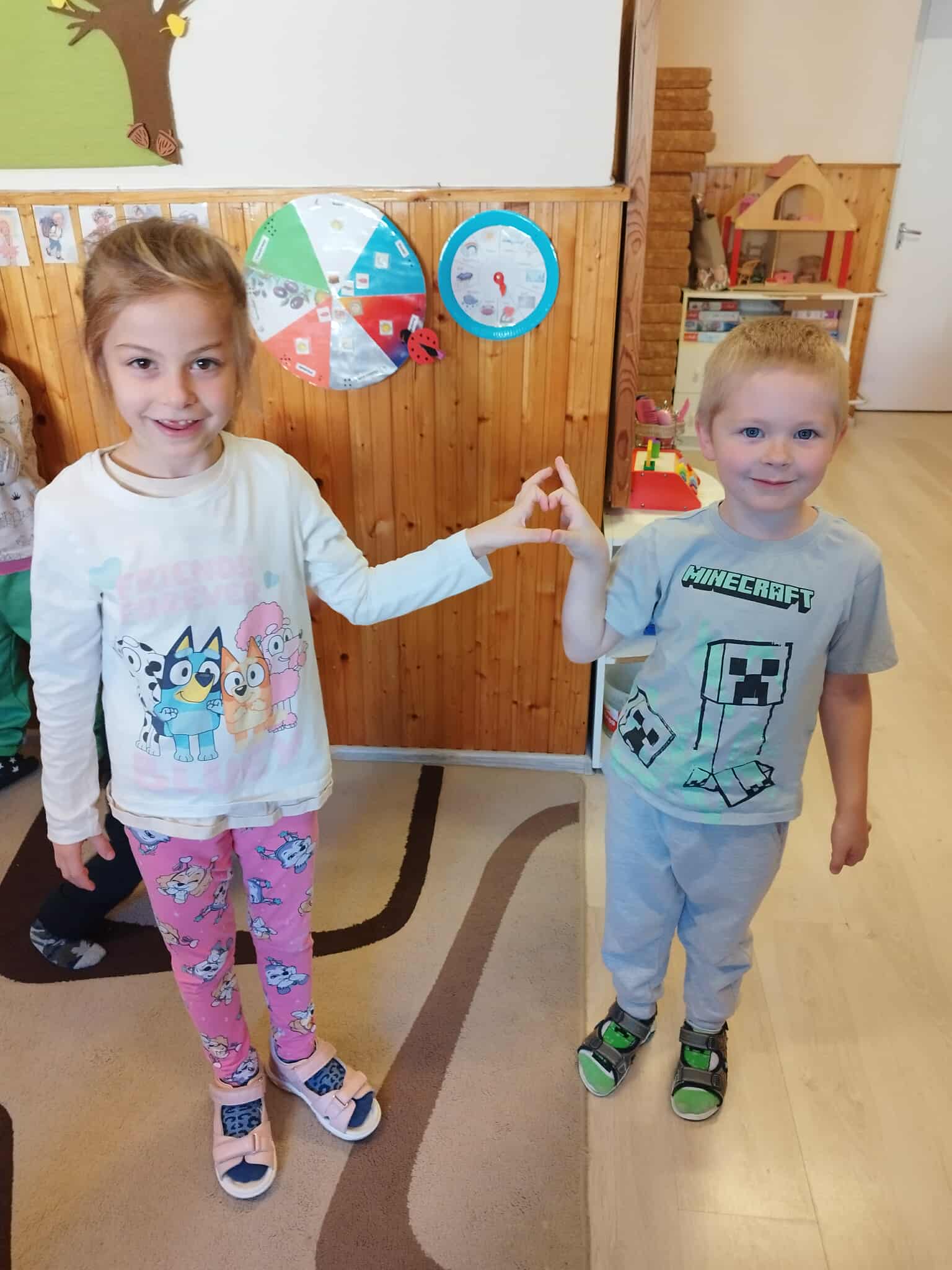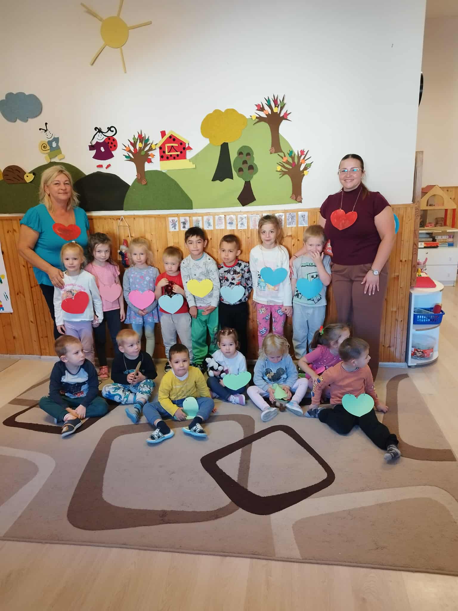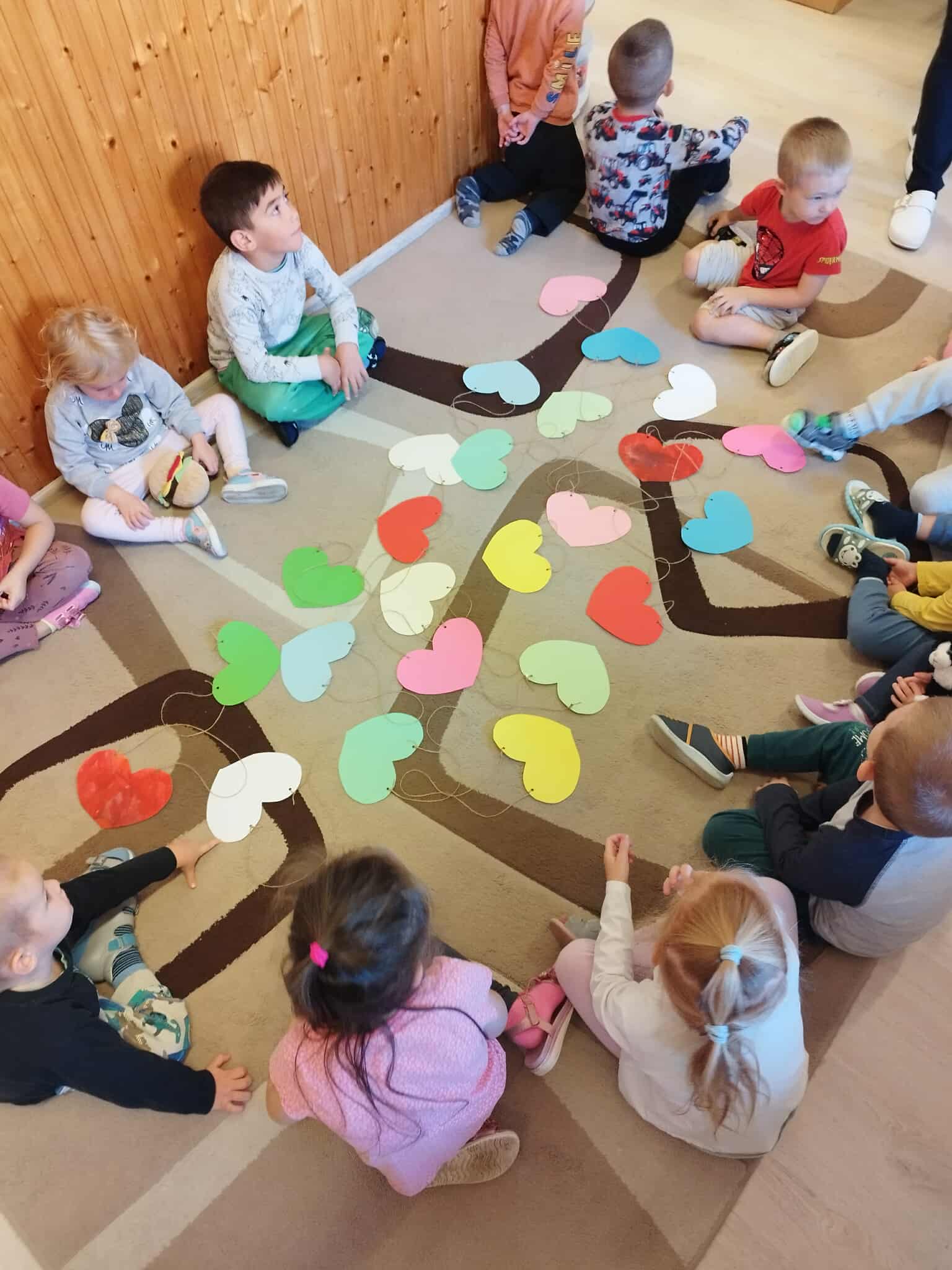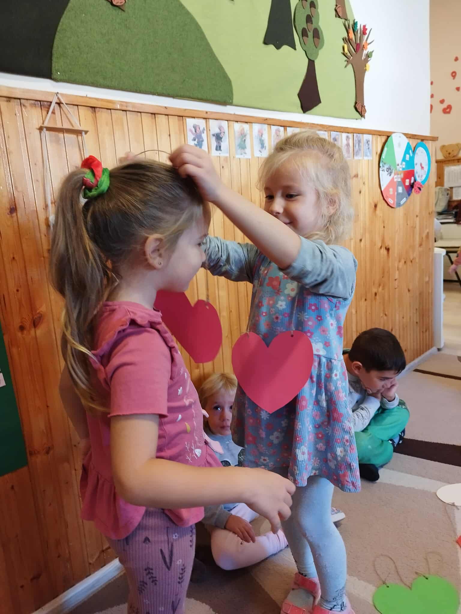 Az Alma együttes-Mutasd meg című dalával hangolódtunk a tevékenységre. Elmutogattuk a dalszöveget, szívet formáltunk az ujjainkkal, mosolyt varázsoltunk az arcunkra, megölelgettük magunkat, majd az égbe emeltük a kezeinket. Ez kellőképpen meghozta a jókedvet a csoportba. Egy nagy körbe leültünk a szőnyegre és a kör közepén papírszíveket helyeztünk el. A feladat az volt, hogy egy gyerek válasszon egy szívet magának, keresse meg a párját és akassza annak a nyakába, aki kedves a számára, akit szeretne megölelni, vagy éppen szeretné szebbé varázsolni a napját. Ezt addig csináltuk, amíg mindenkinek került szív a nyakába, végül jól megölelgettük egymást. Nagyon érzelemdús és megható volt látni, hogy a gyerekek megértették, azt hogy egy apró gesztus elég ahhoz, hogy valakinek jobb legyen a kedve, boldogabb legyen, hogy más legyen a hangulata, látásmódja.