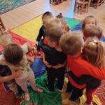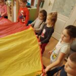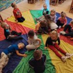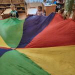 Ezt követően kooperációs ernyő segítségével mozgásos játékot játszottunk: az ernyő mozgásával jelenítettük meg a víz különböző állapotait — a hullámzást, vihart, nyugalmat. A szavak („vihar”, „napsütés”, „mennydörgés”) hatására változtattuk a mozgás intenzitását, így a gyerekek testükön keresztül élhették meg az érzelmek változását.