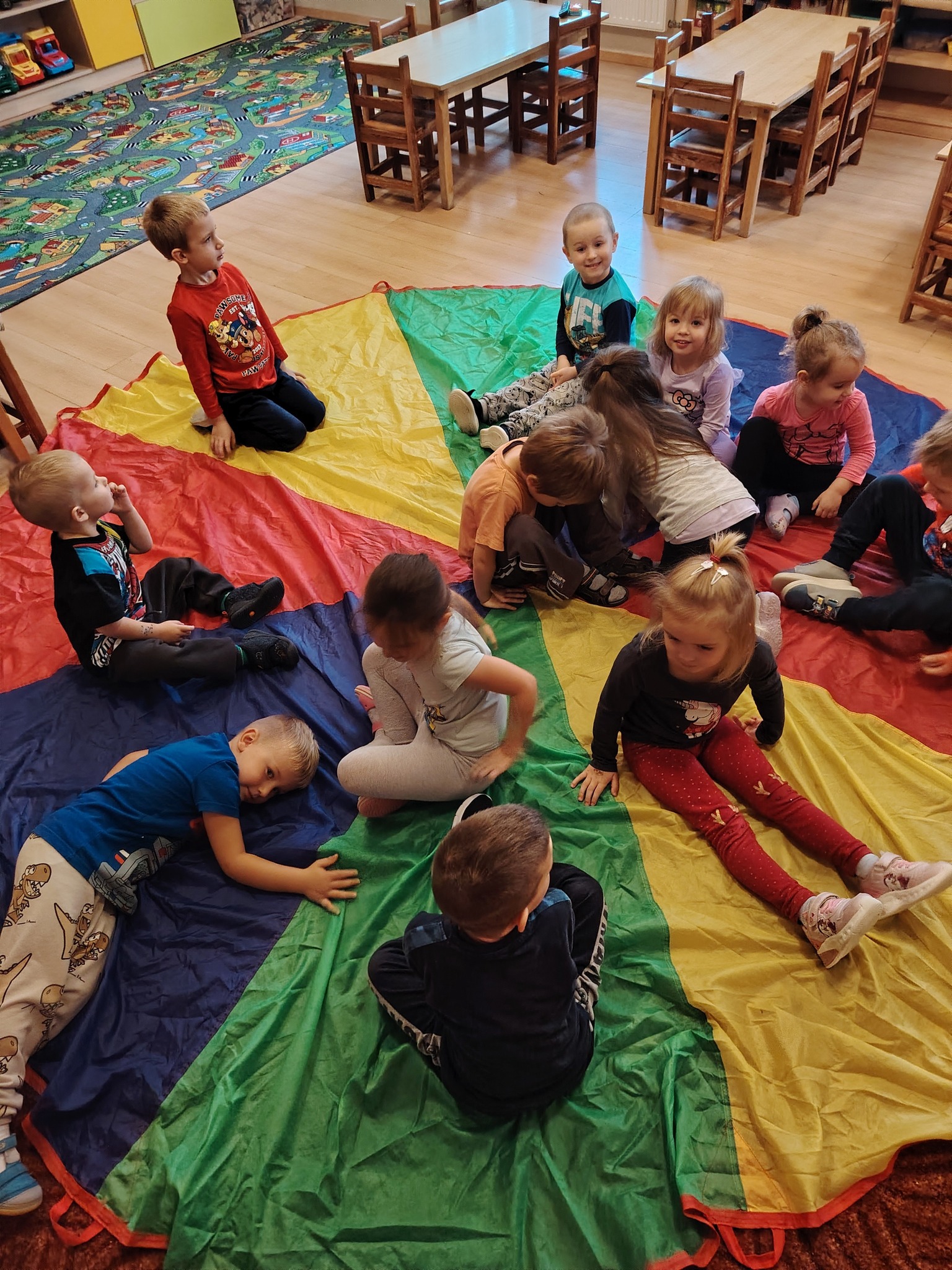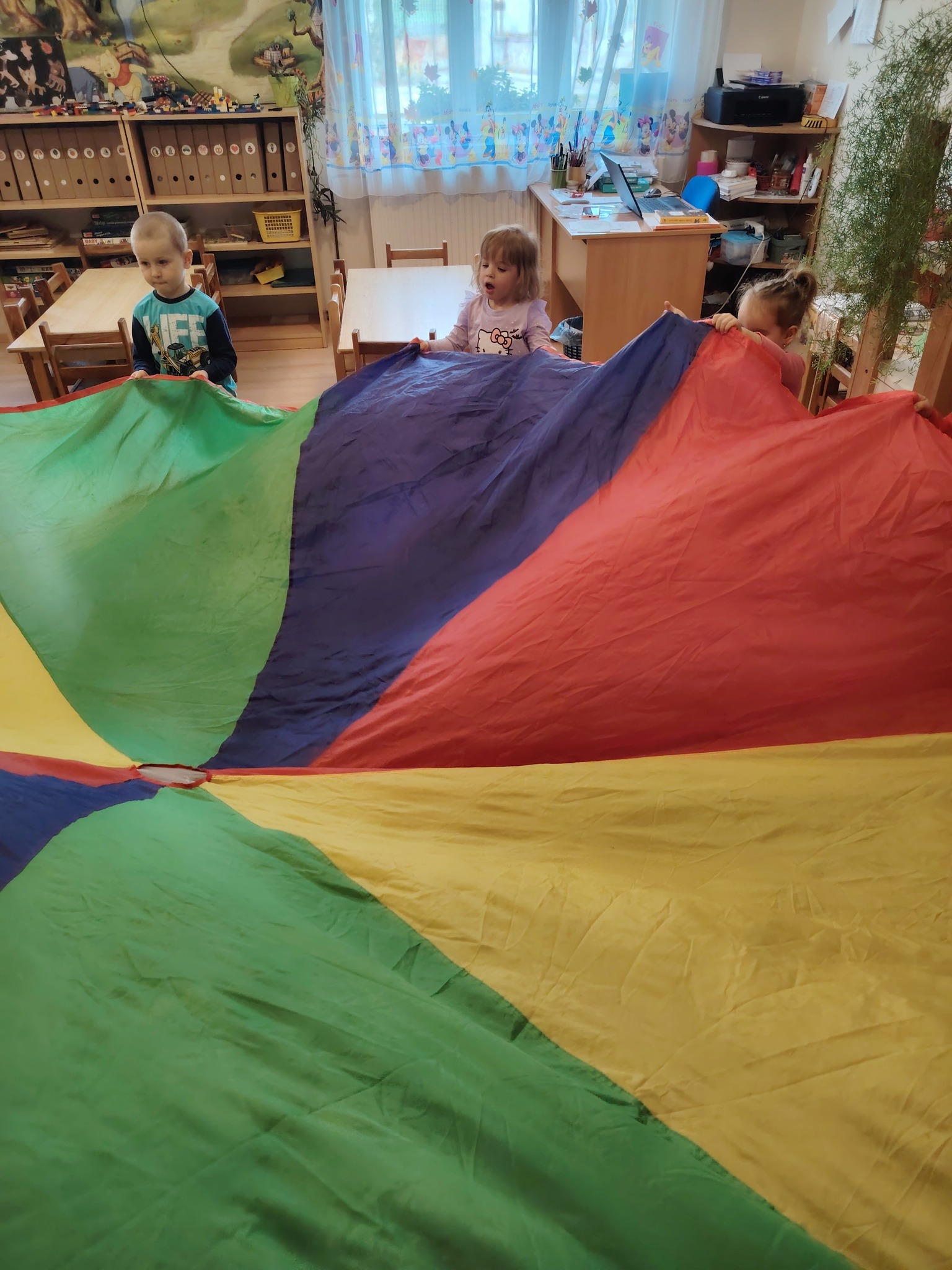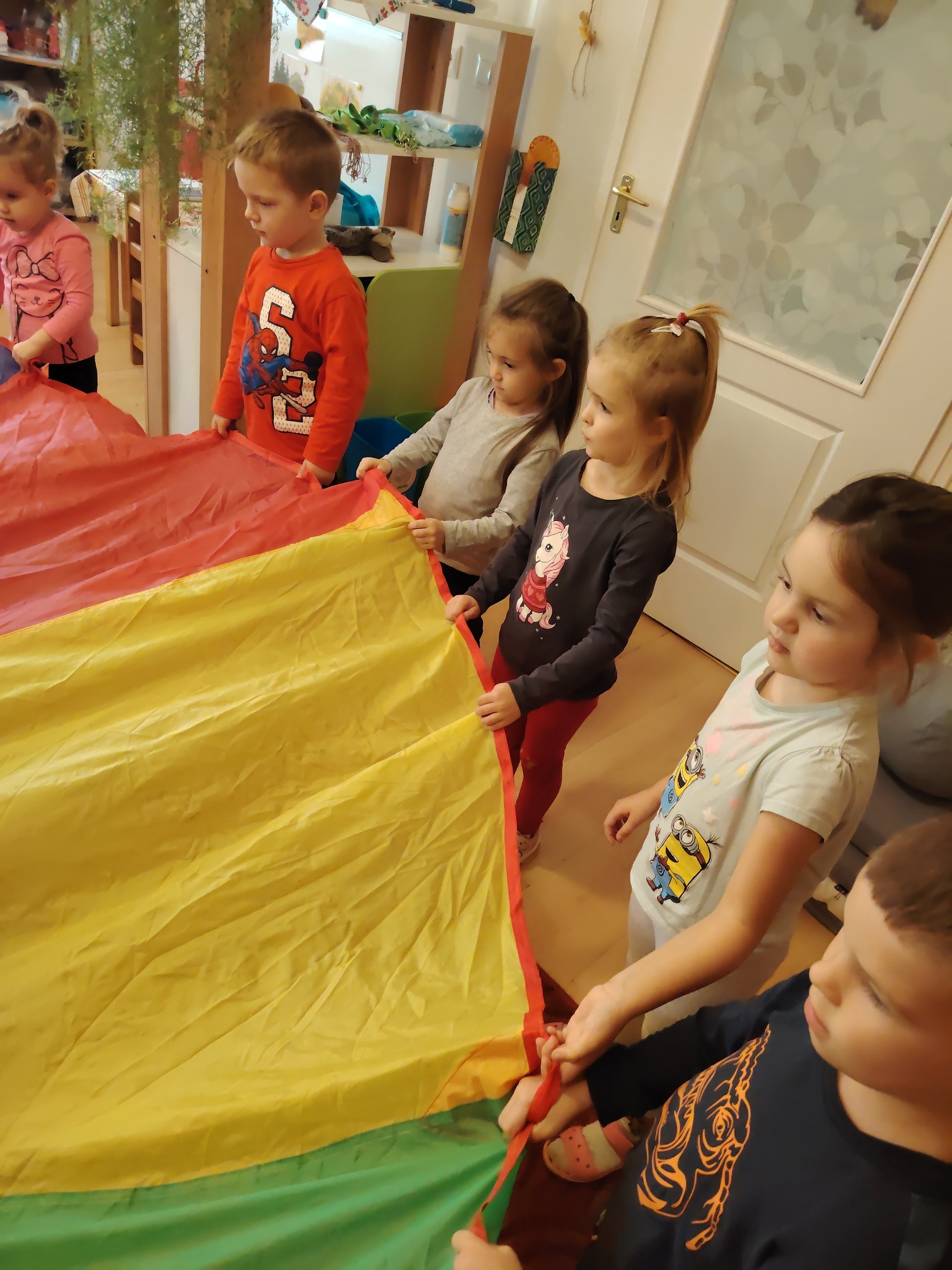Ezt követően kooperációs ernyő segítségével mozgásos játékot játszottunk: az ernyő mozgásával jelenítettük meg a víz különböző állapotait — a hullámzást, vihart, nyugalmat. A szavak („vihar”, „napsütés”, „mennydörgés”) hatására változtattuk a mozgás intenzitását, így a gyerekek testükön keresztül élhették meg az érzelmek változását.