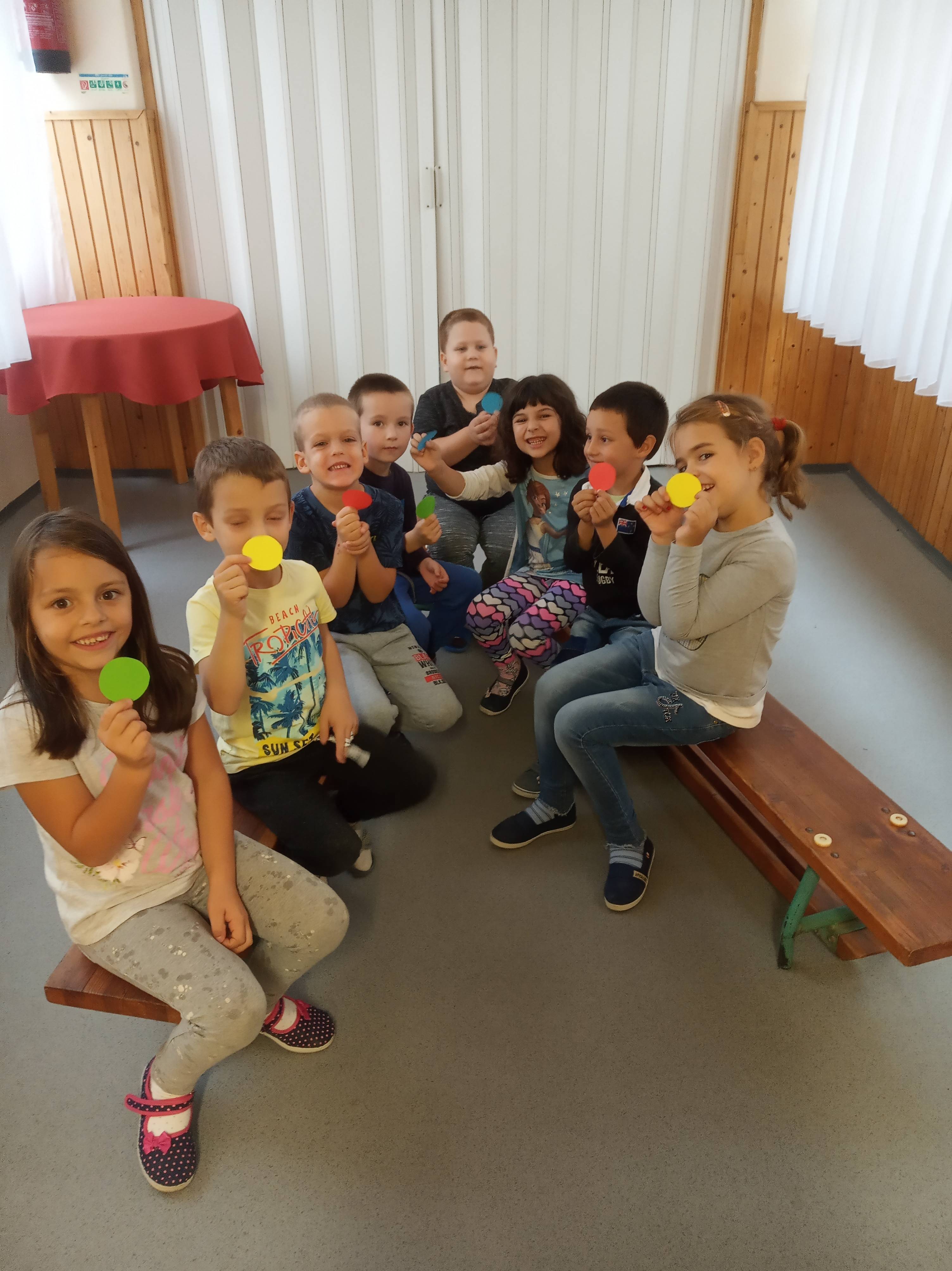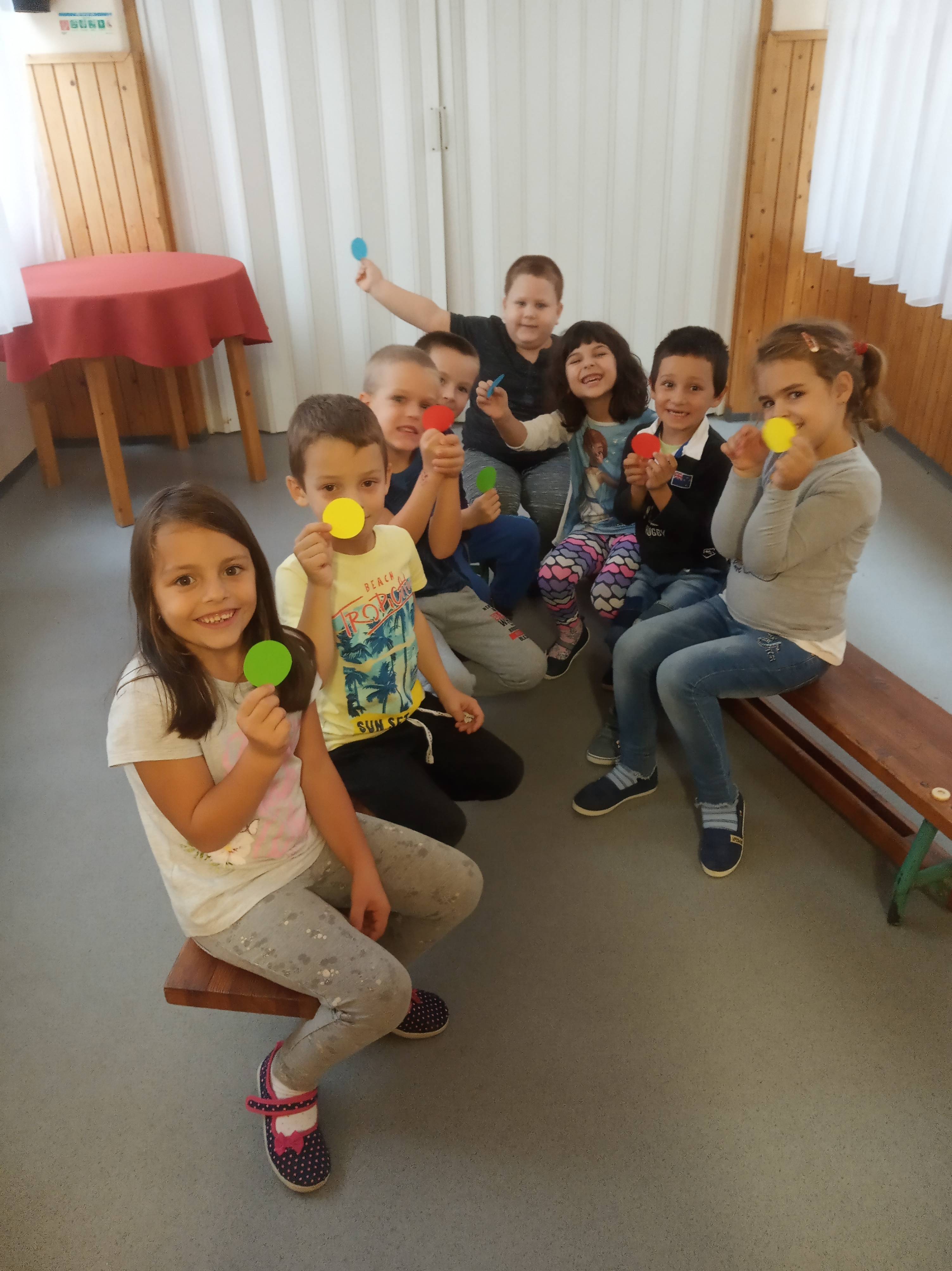 Ezen a kissé szomorkás, esős napon, egy vidám hála játékot játszottunk, amihez színes korongokat választottunk.