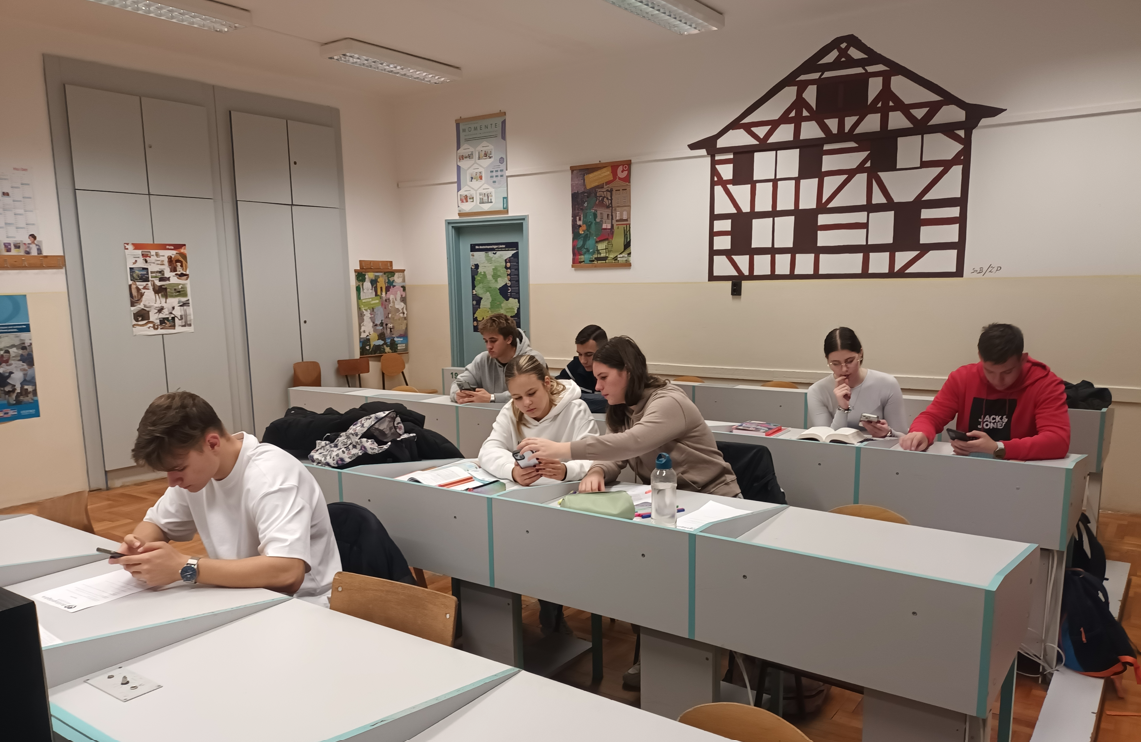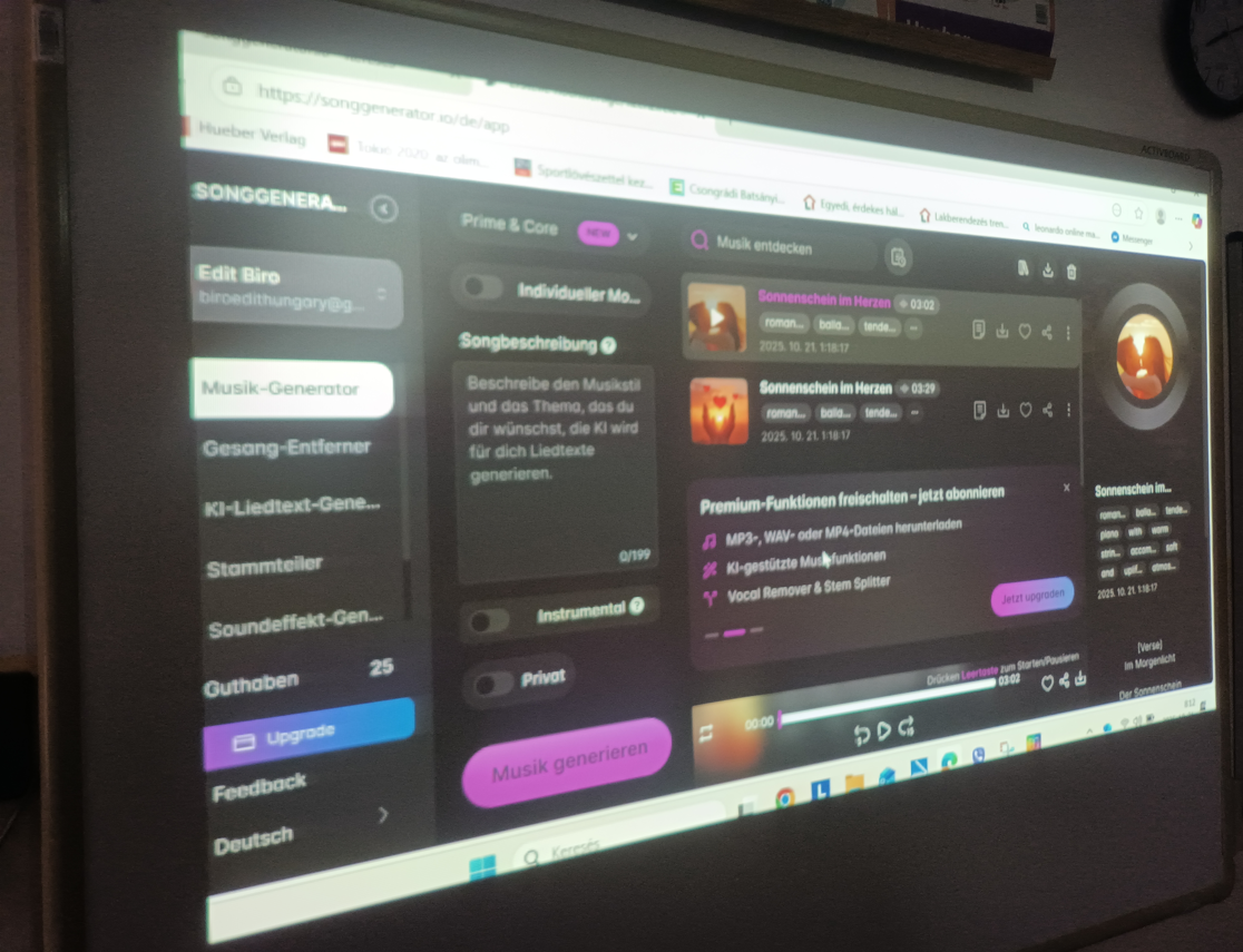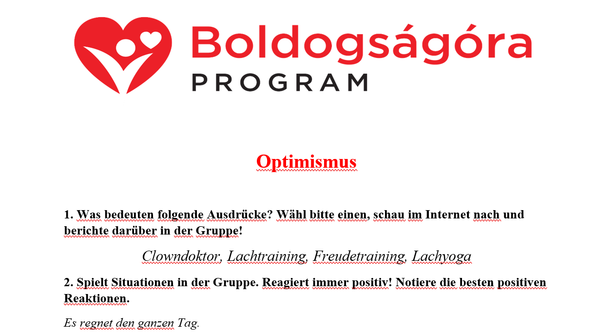 Október 21-én tartottuk a 12F osztályban a második Boldogságóránkat. Egy előzetes feladattal kezdtük az órát: a csoport tagjai németül beszámoltak arról, mit olvastak a neten a bohócdoktorokról, a nevetésterápiáról és a nevetőjógáról. Ezután gyakorlatban is kipróbáltuk a hónap témájának, az optimizmusnak a gyakorlását: a diákok szituációs játékokat játszottak német nyelven, ahol negatív mondatokra, kellemetlen helyzetekre kellett pozitív, optimista válaszokat adniuk. A legjobb, legkreatívabb, legoptimistább reakciókat összegyűjtöttük és együtt megbeszéltük. Kiderült, hogy még a legrosszabb, legkellemetlenebb helyzetben is meg lehet találni a pozitívumot: ha nincs a városban internet, el lehet menni biciklizni, barátokkal találkozni, ha nem ízlik az ebéd a menzán, saját magunk is főzhetünk valamit, amit szeretünk, ha rossz jegyet kapunk egy tantárgyból, ez több tanulásra ösztönözhet bennünket. Az óra végén ismét a mesterséges intelligencia segítségével oldottunk meg egy feladatot: ezúttal az AI Song Generator program segítségével német nyelvű dalt alkottunk, ki lehetett választani a dal stílusát, a témáját (ezúttal természetesen az optimizmus, a pozitív gondolkodás volt a téma), sőt, még néhány szót is, amit a dalnak tartalmaznia kellett. Meghallgattuk a különböző stílusú dalokat, megállapítottuk, hogy minél jobban hasonlítottak egymásra a parancsok, amit megfogalmaztunk, annál inkább megegyeztek az eredményként kapott dalok.