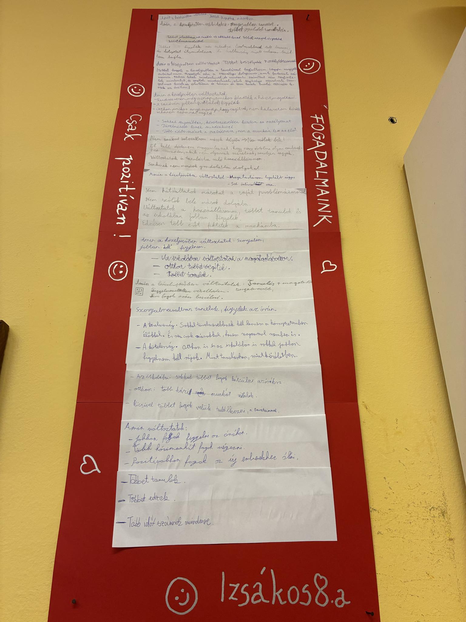 2. „Optimista fogadalmak”: 8.-os diákjaimmal kissé „elszaladt a ló”, a változás érdekében önvizsgálatot tartottunk: mindnyájan átgondoltuk és leírtuk azokat a dolgokat a viselkedésünkben, amelyeket helytelennek tartunk, amelyeken változtatunk.