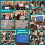 Az optimizmus szó ismert, és szinte minden nap használjuk az osztályban: „Csak optimistán!”. Igyekszünk minden napot pozitívan megélni, akkor is, ha néha nehéz, ha nem úgy sikerül egy felmérő, ha épp nem szépen szólt hozzánk egy barátunk, vagy egyszerűen csak elfáradtunk… Mindig van valaki, aki egy-egy jó szóval emlékeztet minket arra, hogy minden helyzetben meglássuk a jót. A „Pozitív gyerek vagyok” kártyacsomag is segítségünkre van ebben, hiszen olyan megerősítéseket tartalmaz, amik segítenek átlendülni a nehézségeken. Minden kisgyerek talál benne olyan üzenetet, amivel könnyen tud azonosulni, magánál tartva azt a kártyát pedig egész napos támogatást kaphat. Kiválasztottuk a számunkra legigazabb, legmegfelelőbb kártyát, majd a kimondottan az optimizmus üzenetét hordozó kártyák másolatával, saját gondolatainkkal és színes rajzainkkal plakátot készítettünk csoportokban. Ezekre az összeállításokra rápillantva mindig olvashatunk legalább egy olyan üzenetet, ami kapaszkodót nyújt egy-egy nehezebb napon, így elhelyeztük osztálytermünkben az elkészült plakátokat.