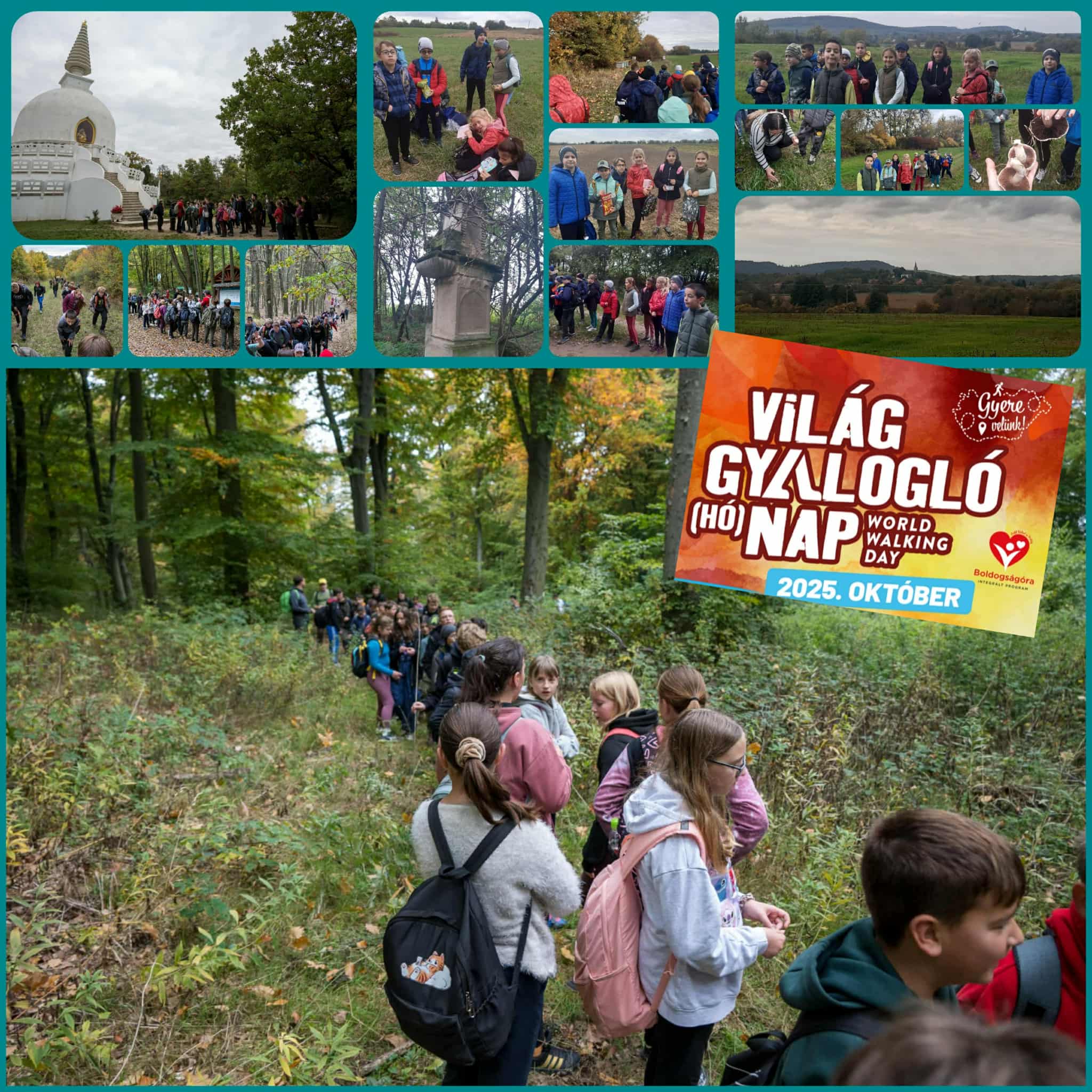 Az alkotáson túl sok időt töltöttünk mozgással. Sportnapunk az esős időjárás miatt átcsúszott októberre, így rögtön egy aktív, tartalmas nappal indítottuk a hónapot. Boldogságóráinkon tovább fokoztuk a mozgás által az örömünket: megtanultuk az örömtáncot, majd szinte minden testnevelés órán a hónapban el is táncoltuk. Csatlakoztunk továbbá a Világ Gyalogló (Hó)Nap felhíváshoz, így túrára indultunk. Minden évben többször sétálunk a gyerekekkel, hogy felfedezzük az iskola, a település környékét. Ilyenkor együtt kirándulnak az osztályok, ami még jobban összehozza közösségünket. A falunk határában rengeteg természeti és történelmi érték található, melyek bejárására mindig szentelünk időt. Különösen szépek a közeli erdők ebben az őszi időszakban, a színek és formák változatossága szemet gyönyörködtető, lelket melengető. Aktív iskolaként a mozgás is mindig nagy szerepet kap iskolánk életében, a gyalogtúrák – lelki egészségünk ápolása mellett – testi egészségünkre, kitartásunkra, mozgásunk és állóképességünk fejlesztésére is remek hatással van. A gyalogló napon az alsó és a felső tagozat külön irányba indult el. A kicsikkel a Sümegcsehi határában lévő Keszthely-kúthoz túráztunk, megtekintettük a mellette álló kőkereszt maradványait. Tovább sétáltunk a régi római kőúton, majd átkeltünk a határban futó patakon, végül egy erdőn-mezőn-szántóföldek mellett haladó úton visszakanyarodtunk az iskola irányába. A felsősök egy közeli falu, Zalaszántó buddhista templomához kirándultak. A közel 10 km-es távot erdőkön keresztül, a Kovácsi-hegyen át, kijelölt túraútvonalon tették meg. Körbejárták az erdei tisztás közepére épült Béke-sztúpát, mely Európa egyik legnagyobb sztúpája. Mindkét csapat tartalmas túrán vett részt: megfigyelhették az erdők és mezők élővilágát, a környék jellemző növényeit és állatait, gombát találtak a fűben, kukoricacsuhét gyűjtöttek kézműveskedéshez, méhkaptárakat és lakóit fedezték fel, a helyi kollégák pedig szívesen meséltek a vidék történelmi és természeti értékeiről. Megfáradva, de élményekkel telve érkeztünk vissza az iskolához, ahol élménybeszámolókat hallgathattunk meg a másik csapattól.