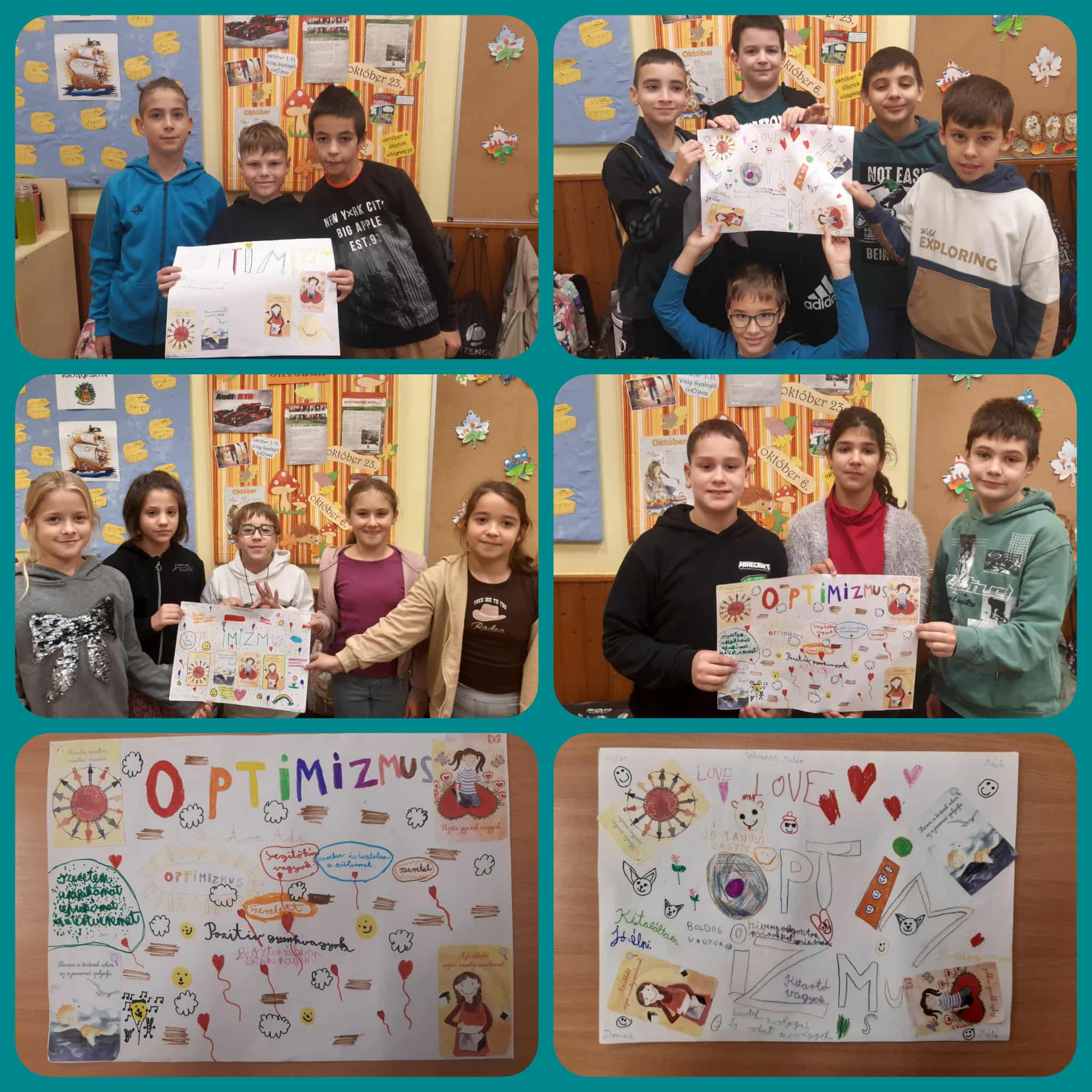 Az optimizmus szó ismert, és szinte minden nap használjuk az osztályban: „Csak optimistán!”. Igyekszünk minden napot pozitívan megélni, akkor is, ha néha nehéz, ha nem úgy sikerül egy felmérő, ha épp nem szépen szólt hozzánk egy barátunk, vagy egyszerűen csak elfáradtunk… Mindig van valaki, aki egy-egy jó szóval emlékeztet minket arra, hogy minden helyzetben meglássuk a jót. A „Pozitív gyerek vagyok” kártyacsomag is segítségünkre van ebben, hiszen olyan megerősítéseket tartalmaz, amik segítenek átlendülni a nehézségeken. Minden kisgyerek talál benne olyan üzenetet, amivel könnyen tud azonosulni, magánál tartva azt a kártyát pedig egész napos támogatást kaphat. Kiválasztottuk a számunkra legigazabb, legmegfelelőbb kártyát, majd a kimondottan az optimizmus üzenetét hordozó kártyák másolatával, saját gondolatainkkal és színes rajzainkkal plakátot készítettünk csoportokban. Ezekre az összeállításokra rápillantva mindig olvashatunk legalább egy olyan üzenetet, ami kapaszkodót nyújt egy-egy nehezebb napon, így elhelyeztük osztálytermünkben az elkészült plakátokat.