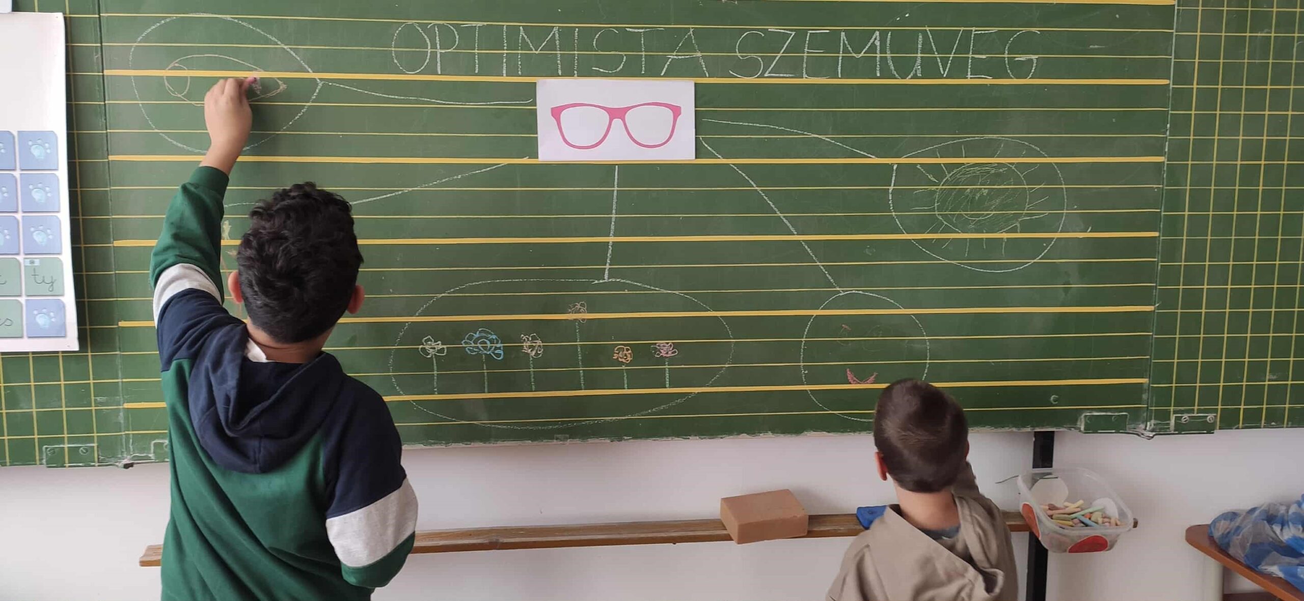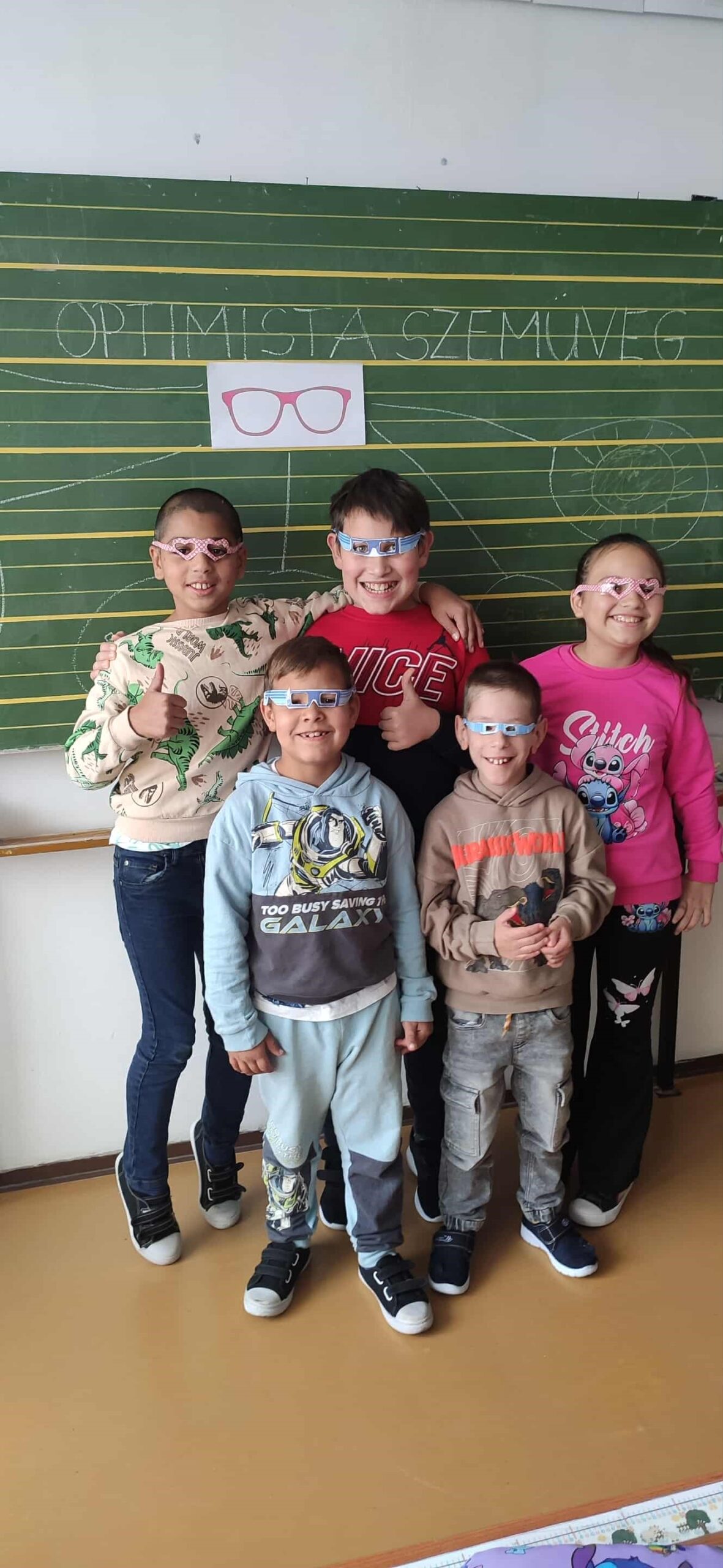 Ezután mindenki készített egy saját optimista szemüveget magának és az óraközi szünetben a folyosóra is kimerészkedtünk, felnőttel gyerekek csodálatára.