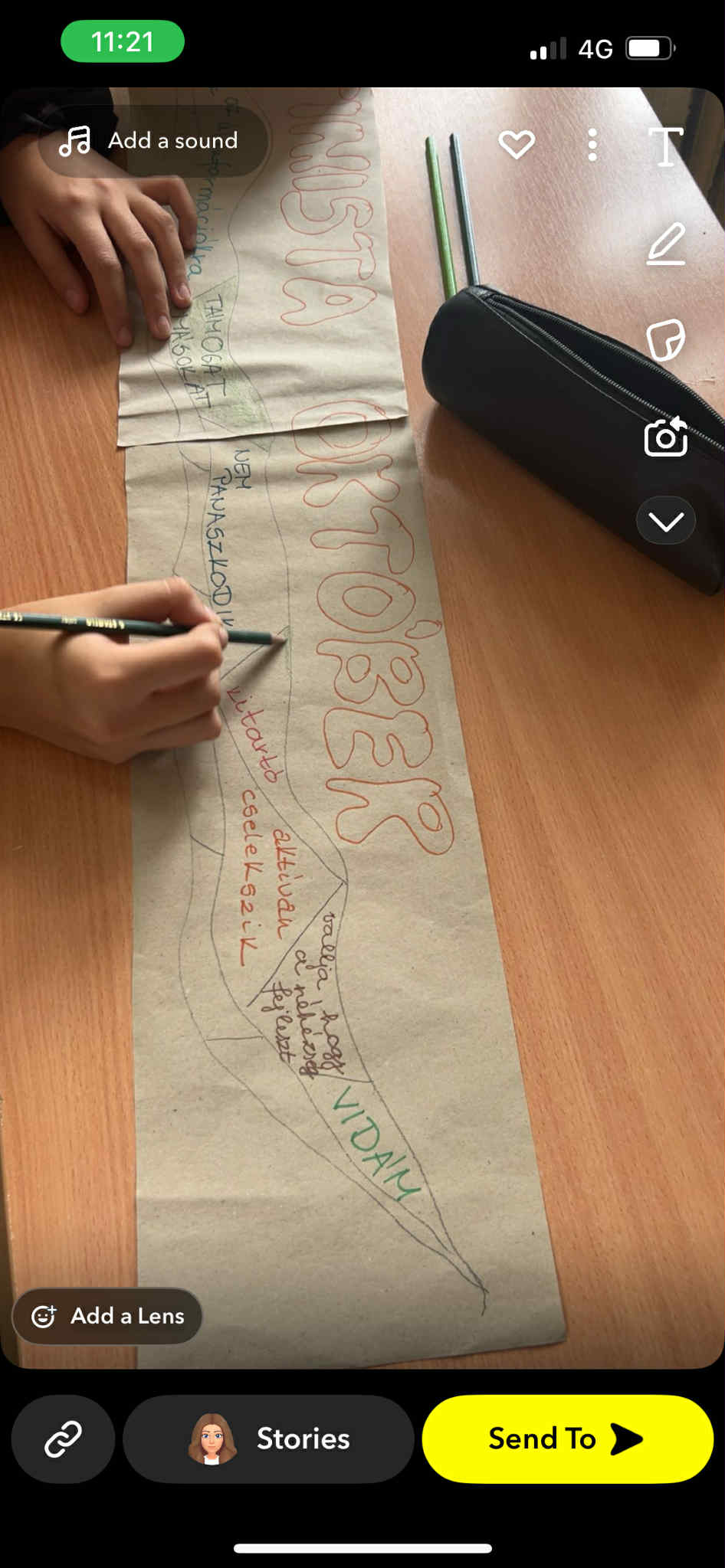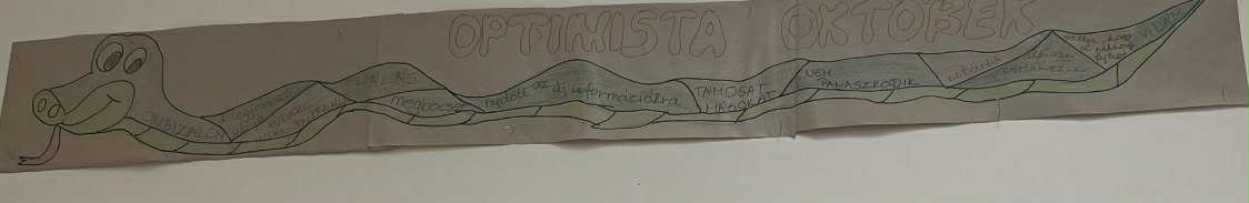 A gyerekekkel megbeszéltük a fogalmat: optimizmus. Felsoroltuk azokat a tulajdonságokat, jellemzőket, amiket egy optimista emberhez tudnánk kapcsolni. Egyikük azt mondta, ez olyan hosszú és egymásba kapcsolódó, mint egy tekerőző kígyó. Ennél az alapötletnél maradtunk és a kulcsszavakat egy barátságos hüllő képében rögzítettük.