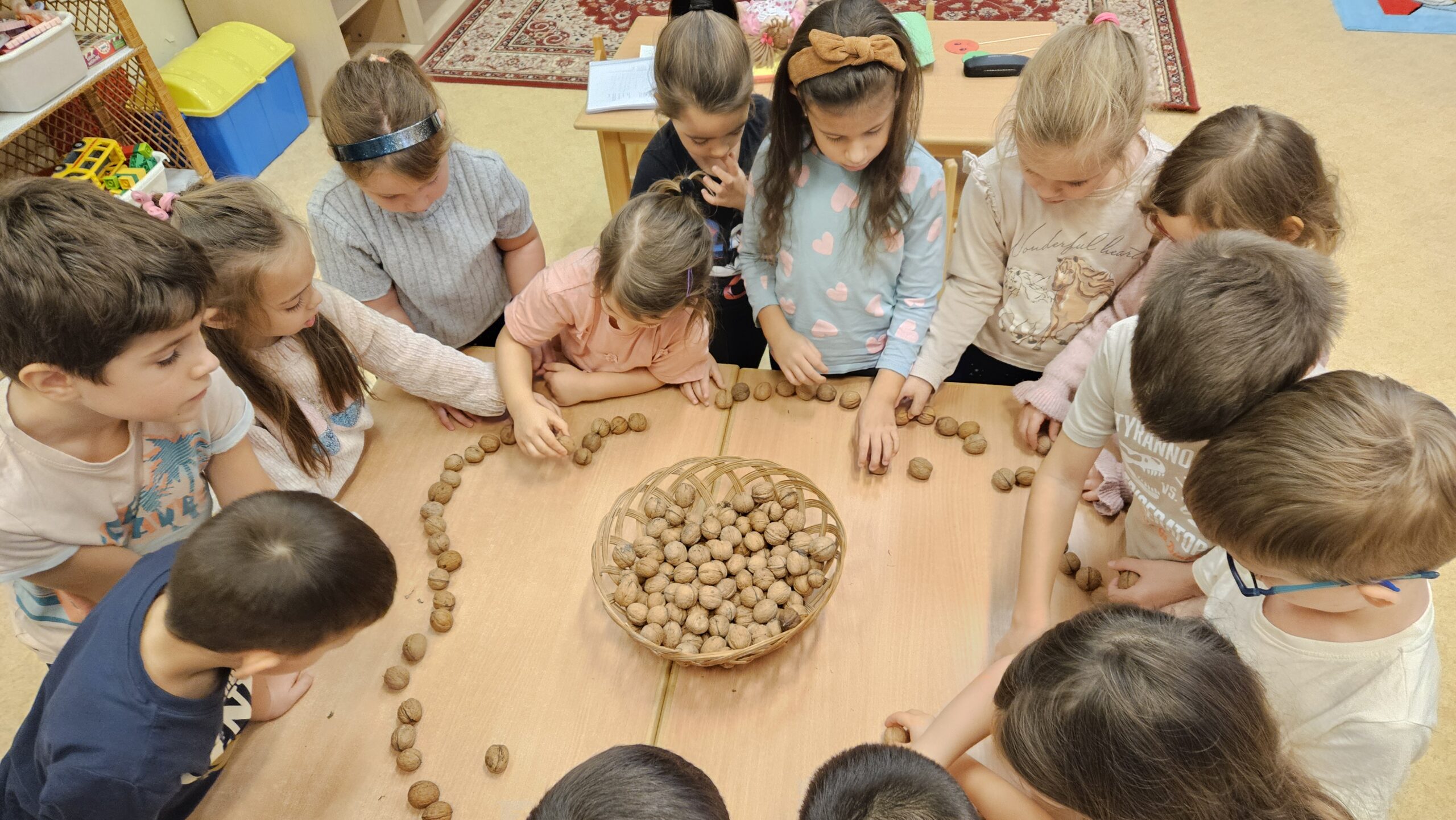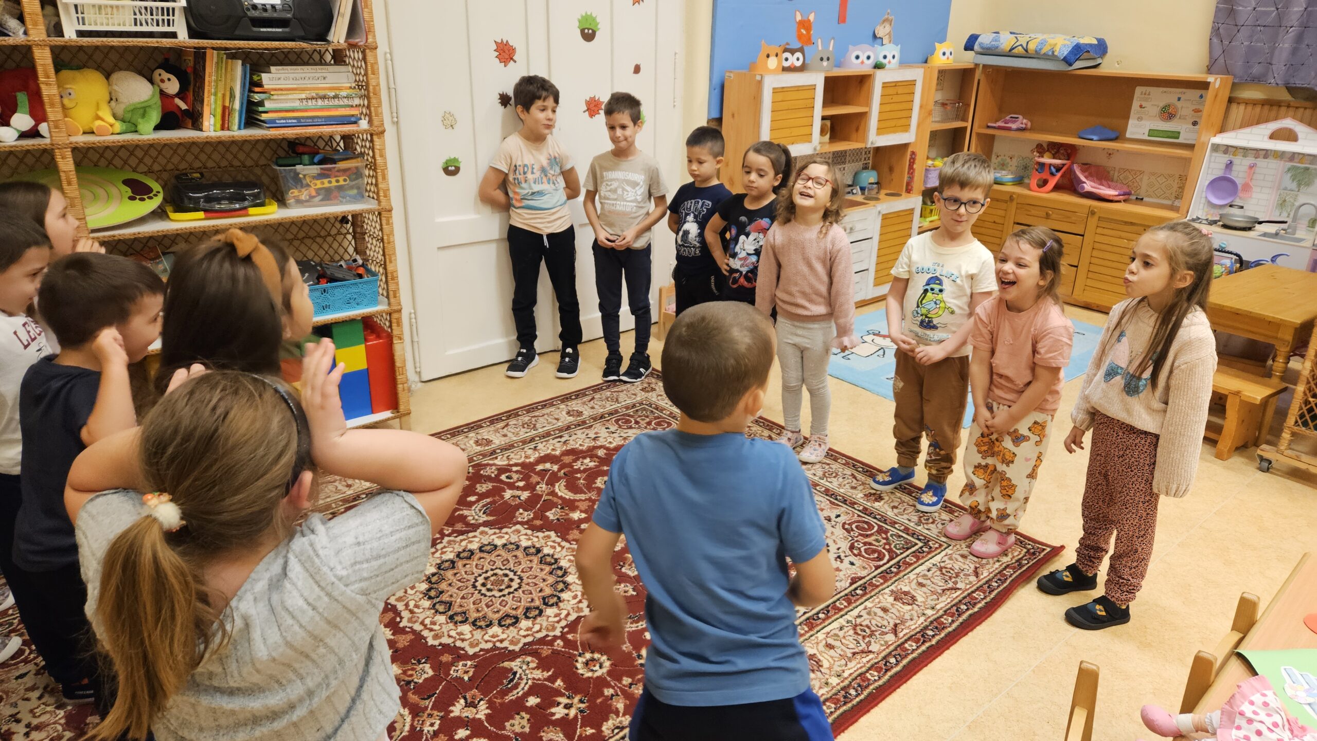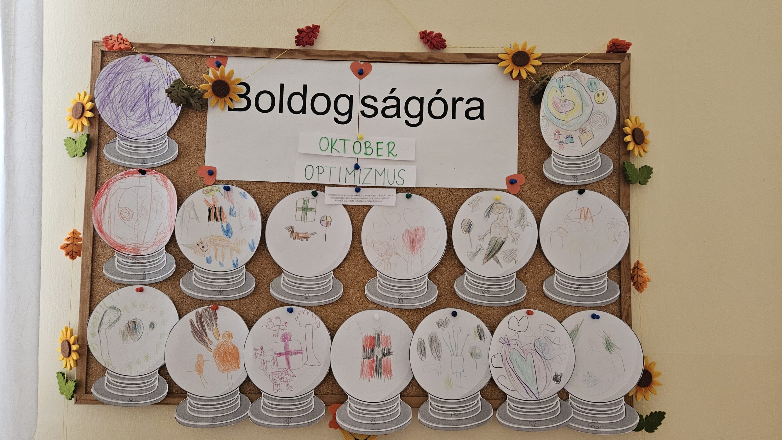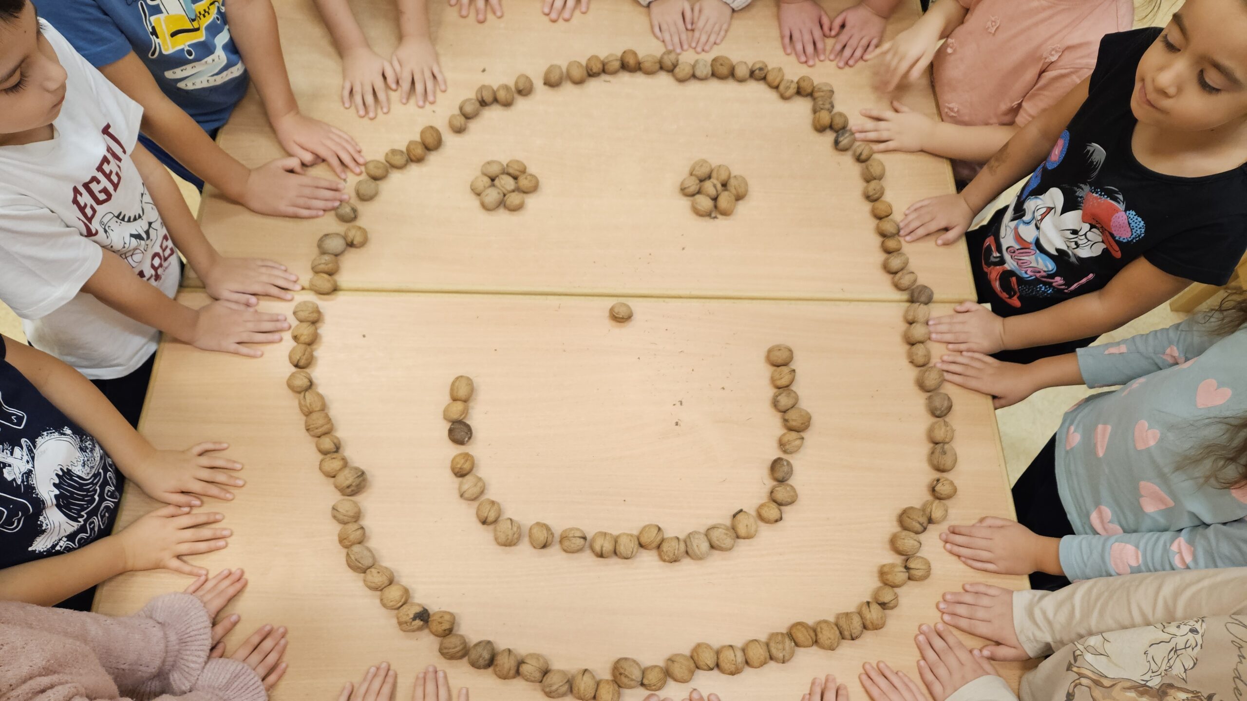 A „beszélgetőkörben” arról beszélgettünk, hogy ki miért volt szomorú mostanában. Mit látnak a gyerekek szépnek a világban, mi az, amin változtatnának, ha megtehetnék. Tanulságos beszélgetés volt. Ezután dióból kiraktuk közösen az optimizmus jelét.